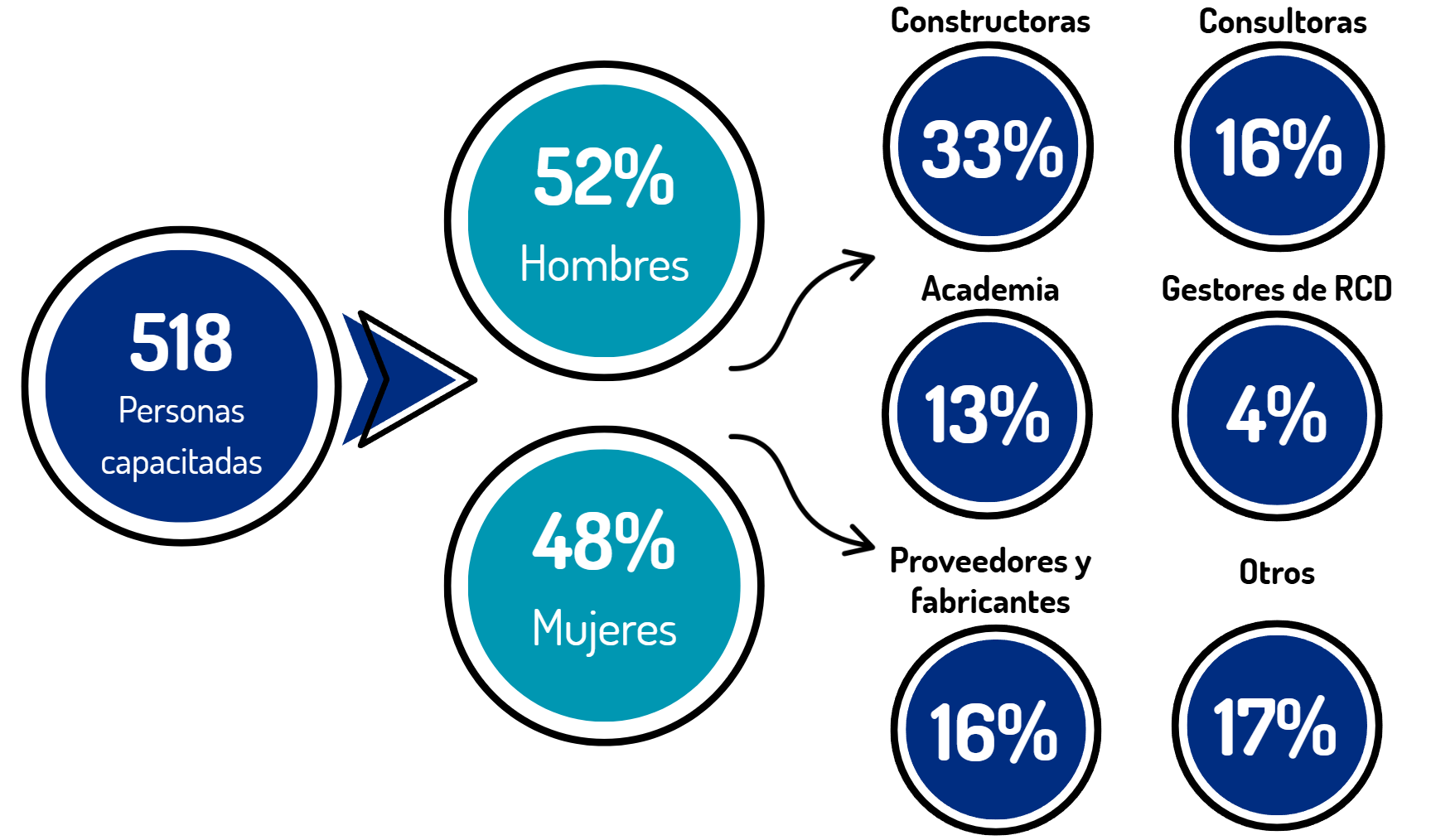Hasta la fecha, la Ruta Nacional ha capacitado a 518 personas en diferentes regiones del país, fortaleciendo sus competencias y conocimientos en sostenibilidad aplicada a la construcción. La participación ha sido equilibrada, con un 52% de hombres y un 48% de mujeres, provenientes de perfiles clave para la transformación del sector: 33% de empresas constructoras, 16% de firmas consultoras, 13% de la academia, 17% de proveedores y fabricantes, y 4% de gestores de residuos de construcción y demolición (RCD). Esta diversidad de actores garantiza que las prácticas y conocimientos adquiridos se implementen y repliquen en todos los niveles de la cadena de valor de la construcción.