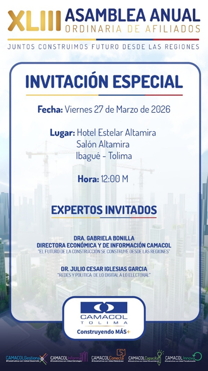 En el marco de este importante encuentro gremial, Camacol Tolima tiene el gusto de invitarle a una invitación especial con expertos de alto nivel, quienes compartirán análisis y perspectivas clave para el sector.