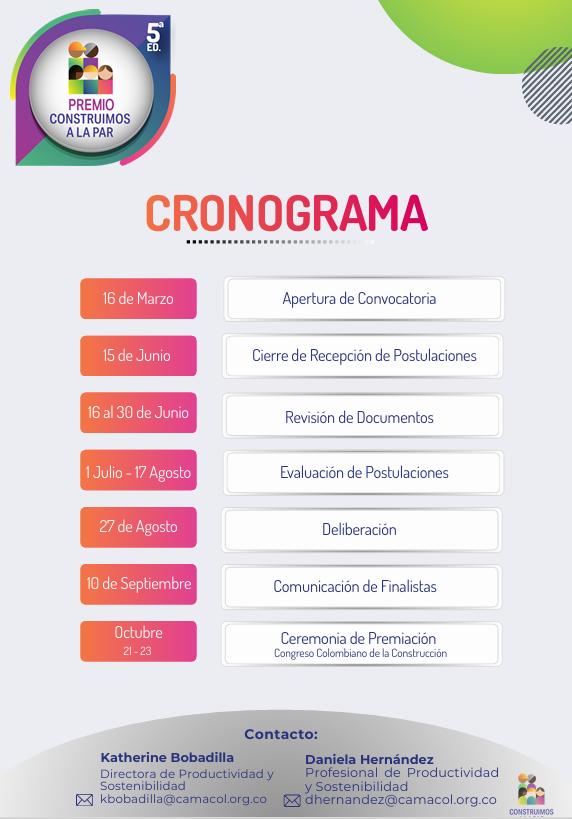 Con el objetivo de reconocer y visibilizar las buenas prácticas de inclusión laboral y la promoción integral al interior de las organizaciones del sector y su cadena de valor, así como el aporte femenino en las obras de construcción y en los cargos de decisión de las empresas, nacen Los premios Construimos a la Par los cuales guían al sector de la construcción a cumplir las metas y Los Objetivos de Desarrollo Sostenible (ODS) propuestos por las Naciones Unidas.