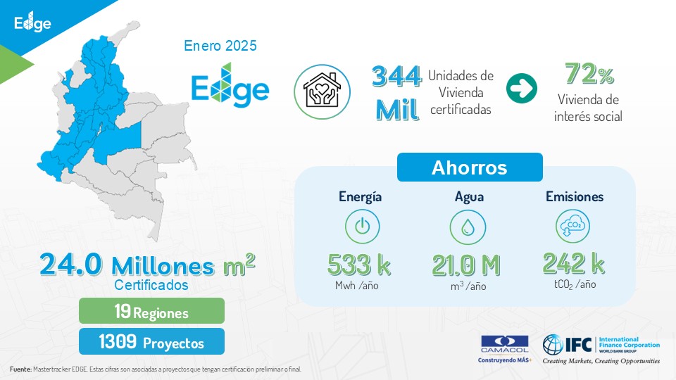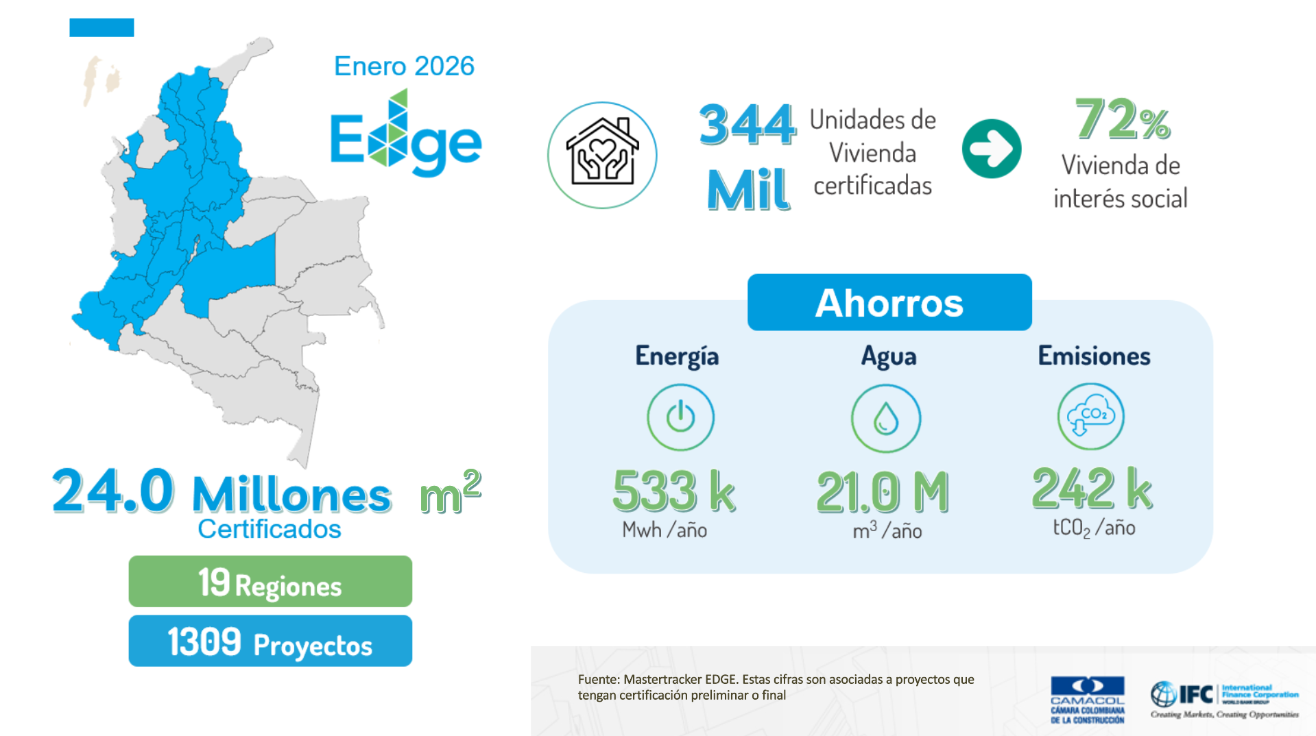 Edge es la certificación líder del país, actualmente cuenta con 24.0 millones de m2 certificados y 1309 proyectos (enero 2026), gracias a la gestión de Camacol la certificación EDGE ha logrado permear el mercado de vivienda en Colombia, contando con más de 344 mil unidades vivienda certificadas. El ahorro de recursos que representan estas cifras anualmente es significativo, dando un gran aporte para cumplir las metas sectoriales en acción climática.