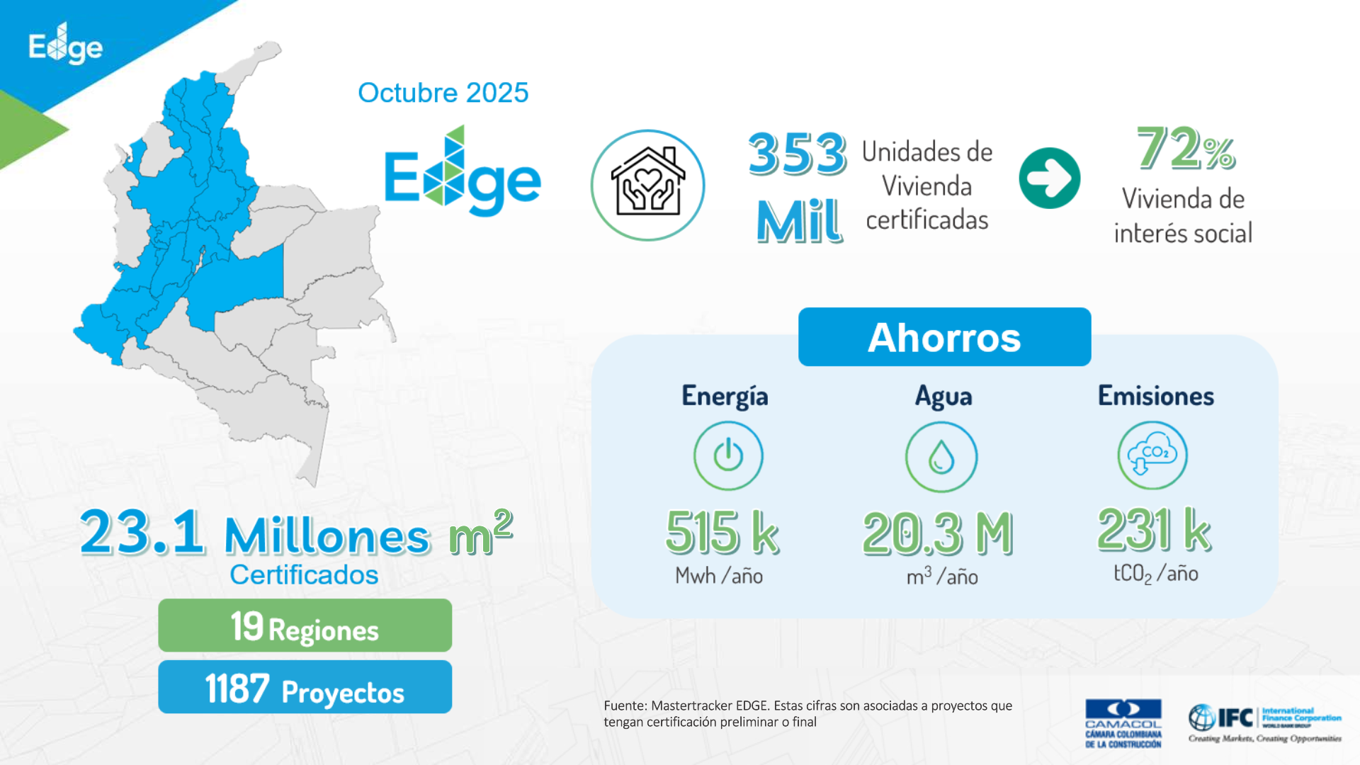 Edge es la certificación líder del país, actualmente cuenta con 23.1 millones de m2 certificados y 1187 proyectos (octubre 2025), gracias a la gestión de Camacol la certificación EDGE ha logrado permear el mercado de vivienda en Colombia, contando con más de 353 mil unidades vivienda certificadas. El ahorro de recursos que representan estas cifras anualmente es significativo, dando un gran aporte para cumplir las metas sectoriales en acción climática.