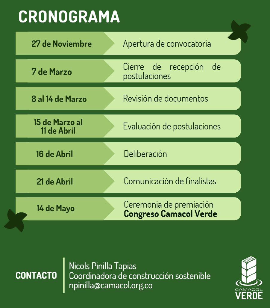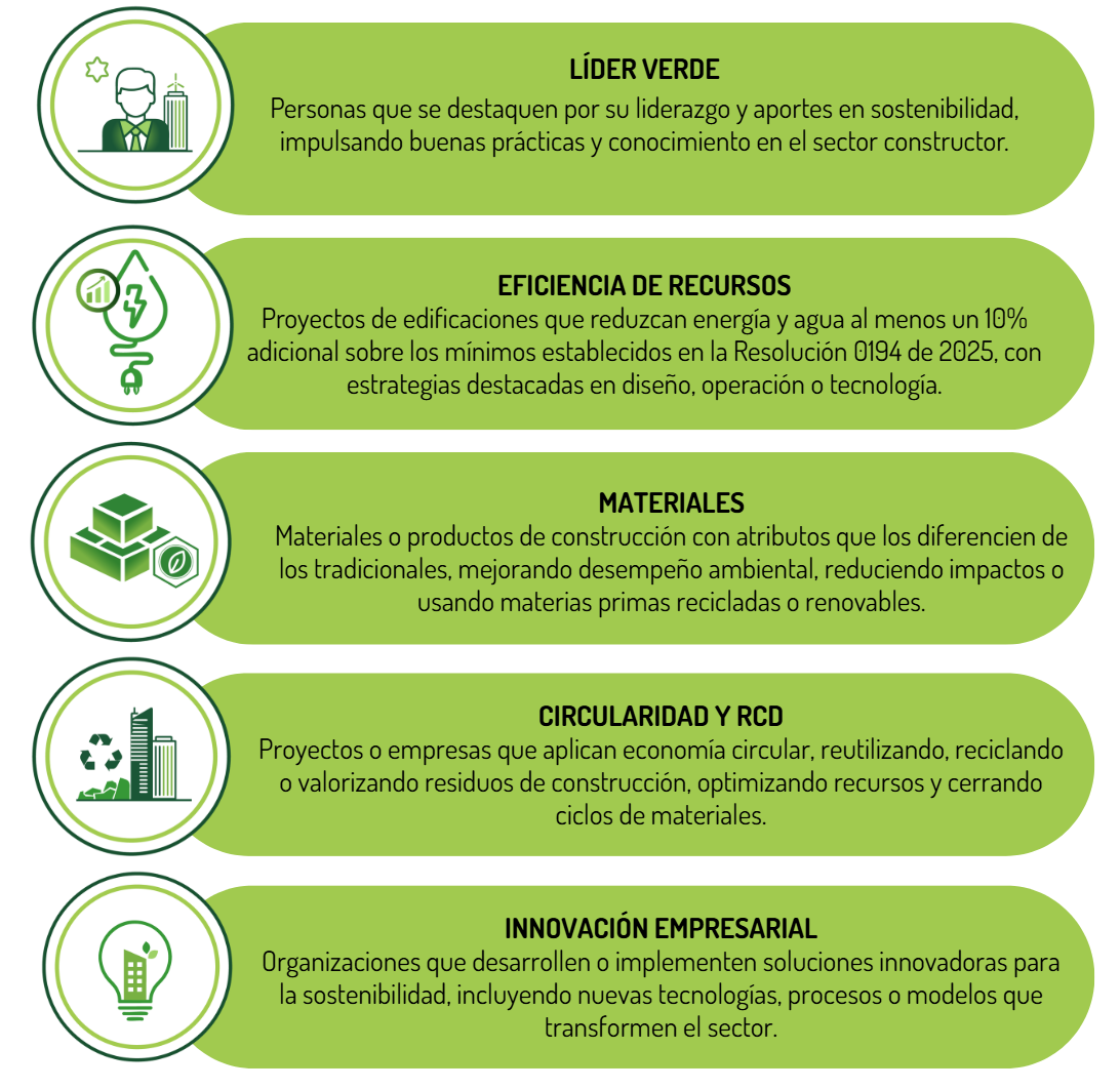 Los Premios Camacol Verde buscan reconocer aquellas iniciativas del sector constructor que tienen como propósito reducir el impacto ambiental y promover una construcción más responsable. A través de seis categorías, esta distinción resalta los esfuerzos de empresas y proyectos comprometidos con la sostenibilidad, como el uso eficiente de recursos, la economía circular, la gestión adecuada de residuos de construcción y demolición (RCD), los materiales sostenibles y la financiación climática. Con un enfoque técnico y un criterio de impacto en la comunidad, Camacol impulsa una industria más consciente, resiliente y respetuosa con el medio ambiente.