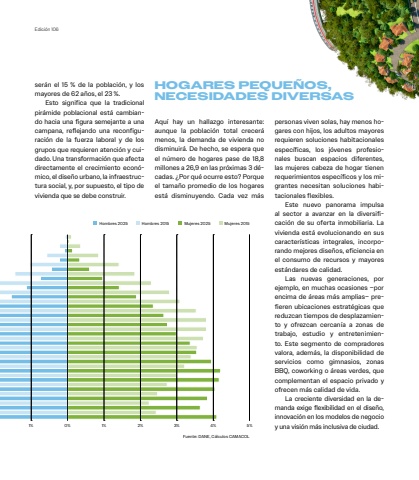 Aqu%u00ed hay un hallazgo interesante: aunque la poblaci%u00f3n total crecer%u00e1 menos, la demanda de vivienda no disminuir%u00e1. De hecho, se espera que el n%u00famero de hogares pase de 18,8 millones a 26,9 en las pr%u00f3ximas 3 d%u00e9cadas. %u00bfPor qu%u00e9 ocurre esto? Porque el tama%u00f1o promedio de los hogares est%u00e1 disminuyendo. Cada vez m%u00e1s ser%u00e1n el 15 % de la poblaci%u00f3n, y los mayores de 62 a%u00f1os, el 23 %.Esto significa que la tradicional pir%u00e1mide poblacional est%u00e1 cambiando hacia una figura semejante a una campana, reflejando una reconfiguraci%u00f3n de la fuerza laboral y de los grupos que requieren atenci%u00f3n y cuidado. Una transformaci%u00f3n que afecta directamente el crecimiento econ%u00f3mico, el dise%u00f1o urbano, la infraestructura social, y, por supuesto, el tipo de vivienda que se debe construir.personas viven solas, hay menos hogares con hijos, los adultos mayores requieren soluciones habitacionales espec%u00edficas, los j%u00f3venes profesionales buscan espacios diferentes, las mujeres cabeza de hogar tienen requerimientos espec%u00edficos y los migrantes necesitan soluciones habitacionales flexibles.Este nuevo panorama impulsa al sector a avanzar en la diversificaci%u00f3n de su oferta inmobiliaria. La vivienda est%u00e1 evolucionando en sus caracter%u00edsticas integrales, incorporando mejores dise%u00f1os, eficiencia en el consumo de recursos y mayores est%u00e1ndares de calidad.Las nuevas generaciones, por ejemplo, en muchas ocasiones %u2013por encima de %u00e1reas m%u00e1s amplias%u2013 prefieren ubicaciones estrat%u00e9gicas que reduzcan tiempos de desplazamiento y ofrezcan cercan%u00eda a zonas de trabajo, estudio y entretenimiento. Este segmento de compradores valora, adem%u00e1s, la disponibilidad de servicios como gimnasios, zonas BBQ, coworking o %u00e1reas verdes, que complementan el espacio privado y ofrecen m%u00e1s calidad de vida.La creciente diversidad en la demanda exige flexibilidad en el dise%u00f1o, innovaci%u00f3n en los modelos de negocio y una visi%u00f3n m%u00e1s inclusiva de ciudad.Fuente: DANE, C%u00e1lculos CAMACOL2% 1% 0% 1% 2% 3% 4% 5%Hombres 2025 Hombres 2015 Mujeres 2025 Mujeres 2015HOGARES PEQUE%u00d1OS, NECESIDADES DIVERSASEdici%u00f3n 106 11