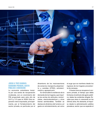 JUEGO A TRES BANDAS: CONSUMO PRIVADO, GASTO P%u00daBLICO E INVERSI%u00d3NLa econom%u00eda colombiana transita por una senda de recuperaci%u00f3n moderada, con un crecimiento del PIB proyectado para este a%u00f1o de 2,6 % y 3 % para el 2026. Esta expansi%u00f3n viene impulsada, principalmente, por el fortalecimiento del sector privado, en particular por el dinamismo de los macrosectores de comercio, transporte, alojamiento y comidas (CTAC), entretenimiento y agropecuario. Es remarcable la resiliencia de la demanda de los hogares, que impulsa las ventas de veh%u00edculos, motocicletas, electrodom%u00e9sticos y otros bienes semidurables. Tambi%u00e9n se destaca la din%u00e1mica del turismo y el gasto en entretenimiento, as%u00ed como el auge que se mantiene desde los ingresos de los hogares proveniente de remesas. A buena hora se recupera el consumo privado, al tiempo que deb%u00eda limitarse el est%u00edmulo del gasto p%u00fablico, dadas las evidentes afugias fiscales que viene in crescendo en los %u00faltimos a%u00f1os. No obstante, el impulso desde la administraci%u00f3n p%u00fablica prevalece, sector que se expande al Foto: Adobe StockEdici%u00f3n 106 17