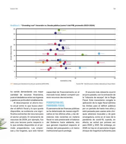 ha venido demandando una mayor cantidad de recursos financieros, pues el desbalance entre sus ingresos y gastos se profundiz%u00f3 notablemente.Al descomponer el ahorro bruto anual entre lo que busca atender el d%u00e9ficit fiscal y lo que queda disponible, se evidencia una significativa estrechez de recursos para el sector privado. El remanente de recursos de 2024, por ejemplo, fue solo una tercera parte respecto a lo que estaba disponible en el periodo prepandemia. Las empresas y los hogares, que solo tienen capacidad de financiamiento en el mercado local, deben competir por esos recursos decrecientes. PERSPECTIVA DEL PANORAMA FISCALEl panorama de las finanzas p%u00fablicas se ha deteriorado de manera significativa en los %u00faltimos a%u00f1os, y las decisiones m%u00e1s recientes en materia fiscal no solo presionar%u00e1n el balance del Gobierno hacia adelante, sino que generan inquietud respecto al manejo del presupuesto y al marco institucional que lo protege.El anuncio m%u00e1s relevante ocurri%u00f3 en junio pasado, con la activaci%u00f3n de la %u201ccl%u00e1usula de escape%u201d de la Regla Fiscal. Este mecanismo congela la aplicaci%u00f3n de la regla fiscal (elimina los l%u00edmites para el d%u00e9ficit p%u00fablico) por un periodo de hasta tres a%u00f1os y est%u00e1 pensada para usarse ante choques adversos inusuales y de gran envergadura, como en el caso de la pandemia de covid-19, cuando, en efecto, se activ%u00f3 por primera vez para 2020 y 2021. Sin embargo, en 2025 no hay en el panorama ning%u00fan choque de magnitud suficiente para Gr%u00e1fico 1: - %u201cCrowding-out%u201d: Inversi%u00f3n vs. Deuda p%u00fablica (como % del PIB, promedio 2023-2024)PP*: Valores para Colombia en los a%u00f1os pre-pandemia (2015-2019). Fuente: FMI %u2013 World Economic Outlook, elaborado por Grupo Cibest.1800601202080140401001600 10 20 30 40 50DEUDA P%u00daBLICA (% PIB)INVERSI%u00d3N (% PIB)SingapurGreciaItaliaArgentinaEspa%u00f1aEstados UnidosFranciaCanad%u00e1IndiaChinaReino UnidoEl SalvadorTailandiaM%u00e9xicoAustraliaPer%u00faGuatemalaSuiza VietnamPP* Panam%u00e1BrasilCosta RicaColombiaAlemaniaChileEdici%u00f3n 106 19