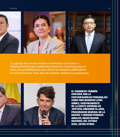 La agenda del evento reunir%u00e1 a invitados nacionales e internacionales que analizar%u00e1n temas de coyuntura para el pa%u00eds, y las posibilidades que ofrece la industria edificadora en varios frentes. Tres d%u00edas de an%u00e1lisis, debates y propuestas.EL CONGRESO TAMBI%u00c9N CONTAR%u00c1 CON LA PARTICIPACI%u00d3N DE PERSONAJES COMO IV%u00c1N MAURICIO LENIS G%u00d3MEZ, VICEPRESIDENTE DE LA CORTE SUPREMA DE JUSTICIA; GREGORIO ELJACH, PROCURADOR GENERAL DE LA NACI%u00d3N, Y HERN%u00c1N PENAGOS GIRALDO, REGISTRADOR NACIONAL DEL ESTADO CIVIL, ENTRE OTROS.Edici%u00f3n 106 31