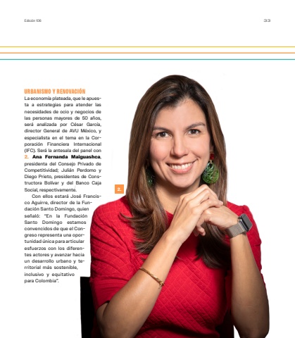 URBANISMO Y RENOVACI%u00d3NLa econom%u00eda plateada, que le apuesta a estrategias para atender las necesidades de ocio y negocios de las personas mayores de 50 a%u00f1os, ser%u00e1 analizada por C%u00e9sar Garc%u00eda, director General de AVU M%u00e9xico, y especialista en el tema en la Corporaci%u00f3n Financiera Internacional (IFC). Ser%u00e1 la antesala del panel con 2. Ana Fernanda Maiguashca, presidenta del Consejo Privado de Competitividad; Juli%u00e1n Perdomo y Diego Prieto, presidentes de Constructora Bol%u00edvar y del Banco Caja Social, respectivamente.Con ellos estar%u00e1 Jos%u00e9 Francisco Aguirre, director de la Fundaci%u00f3n Santo Domingo, quien se%u00f1al%u00f3: %u201cEn la Fundaci%u00f3n Santo Domingo estamos convencidos de que el Congreso representa una oportunidad %u00fanica para articular esfuerzos con los diferentes actores y avanzar hacia un desarrollo urbano y territorial m%u00e1s sostenible, inclusivo y equitativo para Colombia%u201d.2.Edici%u00f3n 106 33