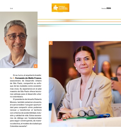 En su turno, el arquitecto brasile%u00f1o 3. Fernando de Mello Franco, exsecretario de Desarrollo Urbano de S%u00e3o Paulo, compartir%u00e1 su enfoque de las ciudades como ecosistemas vivos. Su experiencia en el plan maestro de S%u00e3o Paulo ofrece lecciones valiosas para el desarrollo urbano colombiano.El presidente de Amarilo Roberto Moreno, tambi%u00e9n estar%u00e1 en el evento, el cual considera %u201cuna gran oportunidad para compartir c%u00f3mo podemos renovar y transformar el territorio con criterios de sostenibilidad, inclusi%u00f3n y calidad de vida. Estos escenarios de di%u00e1logo son fundamentales para seguir construyendo, de manera colectiva, el modelo de ciudad que Colombia necesita%u201d.3.4.34 Revista