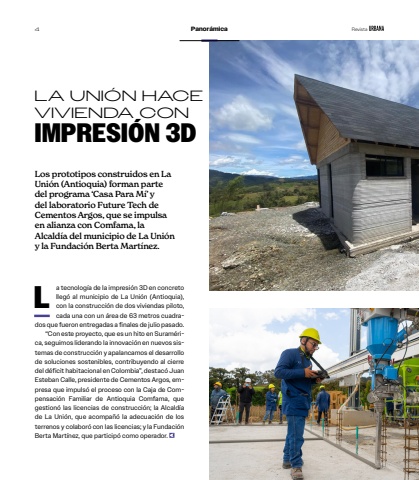 L a tecnolog%u00eda de la impresi%u00f3n 3D en concreto lleg%u00f3 al municipio de La Uni%u00f3n (Antioquia), con la construcci%u00f3n de dos viviendas piloto, cada una con un %u00e1rea de 63 metros cuadrados que fueron entregadas a finales de julio pasado.%u201cCon este proyecto, que es un hito en Suram%u00e9rica, seguimos liderando la innovaci%u00f3n en nuevos sistemas de construcci%u00f3n y apalancamos el desarrollo de soluciones sostenibles, contribuyendo al cierre del d%u00e9ficit habitacional en Colombia%u201d, destac%u00f3 Juan Esteban Calle, presidente de Cementos Argos, empresa que impuls%u00f3 el proceso con la Caja de Compensaci%u00f3n Familiar de Antioquia Comfama, que gestion%u00f3 las licencias de construcci%u00f3n; la Alcald%u00eda de La Uni%u00f3n, que acompa%u00f1%u00f3 la adecuaci%u00f3n de los terrenos y colabor%u00f3 con las licencias; y la Fundaci%u00f3n Berta Mart%u00ednez, que particip%u00f3 como operador. IMPRESI%u00d3N 3DLA UNI%u00d3N HACE VIVIENDA CONLos prototipos construidos en La Uni%u00f3n (Antioquia) forman parte del programa %u2018Casa Para M%u00ed%u2019 y del laboratorio Future Tech de Cementos Argos, que se impulsa en alianza con Comfama, la Alcald%u00eda del municipio de La Uni%u00f3n y la Fundaci%u00f3n Berta Mart%u00ednez.4 Panor%u00e1mica Revista