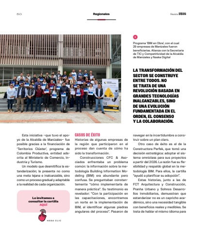 Esta iniciativa %u2013que tuvo el apoyo de la Alcald%u00eda de Manizales%u2013 fue posible gracias a la financiaci%u00f3n de %u2018Territorios Cl%u00faster%u2019, programa de Colombia Productiva, entidad adscrita al Ministerio de Comercio, Industria y Turismo. Un modelo que desmitifica la estandarizaci%u00f3n; la presenta no como una meta lejana e inalcanzable, sino como un proceso gradual y adaptable a la realidad de cada organizaci%u00f3n.Le invitamos a consultar la cartillaAQU%u00cdHAGA CLICCASOS DE %u00c9XITOHistorias de algunas empresas de la regi%u00f3n que participaron en el proceso dan cuenta de c%u00f3mo ha sido la transformaci%u00f3n.Construcciones CFC & Asociados enfrentaba un problema com%u00fan: la informaci%u00f3n sobre la metodolog%u00eda Building Information Modeling (BIM) era abundante pero confusa. Se preguntaban constantemente %u201cc%u00f3mo implementarla de manera pr%u00e1ctica%u201d. Su testimonio es revelador: %u201cCon la participaci%u00f3n en las capacitaciones, encontramos un norte en la implementaci%u00f3n de BIM, al identificar algunas piedras angulares del proceso%u201d. Pasaron de navegar en la incertidumbre a construir sobre un plan claro.Otro caso de %u00e9xito es el de la Constructora Perfek, que tom%u00f3 una decisi%u00f3n estrat%u00e9gica: adoptar el sistema omniclass para sus proyectos a partir del 2026. La raz%u00f3n fue su flexibilidad y respaldo global en la metodolog%u00eda BIM. Para ellos, la cartilla %u201cayud%u00f3 a planificar su adopci%u00f3n%u201d.Estas historias, junto a las de FCT Arquitectura y Construcci%u00f3n, Pranha Urbano y Sohnos Desarrollos Inmobiliarios, demuestran que estandarizar no es un capricho acad%u00e9mico, sino una necesidad tangible con beneficios reales y medibles. Se trata de hablar el mismo idioma para LA TRANSFORMACI%u00d3N DEL SECTOR SE CONSTRUYE ENTRE TODOS. NO SE TRATA DE UNA REVOLUCI%u00d3N BASADA EN GRANDES TECNOLOG%u00cdAS INALCANZABLES, SINO DE UNA EVOLUCI%u00d3N FUNDAMENTADA EN EL ORDEN, EL CONSENSO Y LA COLABORACI%u00d3N.Programa %u2018BIM en Obra%u2019, con el cual 29 empresas de Manizales fueron beneficiarias. Alianza con la Secretaria de TIC y Competitividad de la Alcald%u00eda de Manizales y Naska Digital50 Regionales Revista