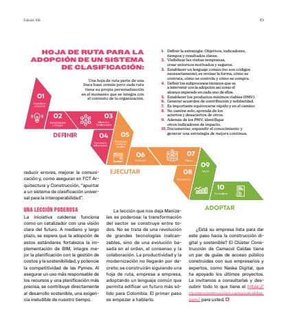 reducir errores, mejorar la comunicaci%u00f3n y, como aseguran en FCT Arquitectura y Construcci%u00f3n, %u201capuntar a un sistema de clasificaci%u00f3n universal para la interoperabilidad%u201d.UNA LECCI%u00d3N PODEROSALa iniciativa caldense funciona como un catalizador con una visi%u00f3n clara del futuro. A mediano y largo plazo, se espera que la adopci%u00f3n de estos est%u00e1ndares fortalezca la implementaci%u00f3n de BIM, integre mejor la planificaci%u00f3n con la gesti%u00f3n de costos y la sostenibilidad, y potencie la competitividad de las Pymes. Al asegurar un uso m%u00e1s responsable de los recursos y una planificaci%u00f3n m%u00e1s precisa, se contribuye directamente al desarrollo sostenible, una exigencia ineludible de nuestro tiempo.La lecci%u00f3n que nos deja Manizales es poderosa: la transformaci%u00f3n del sector se construye entre todos. No se trata de una revoluci%u00f3n de grandes tecnolog%u00edas inalcanzables, sino de una evoluci%u00f3n basada en el orden, el consenso y la colaboraci%u00f3n. La productividad y la modernizaci%u00f3n no llegar%u00e1n por decreto; se construir%u00e1n siguiendo una hoja de ruta, empresa a empresa, adoptando un lenguaje com%u00fan que permita edificar un futuro m%u00e1s s%u00f3lido para Colombia. El primer paso es empezar a hablarlo.%u00bfEst%u00e1 su empresa lista para dar este paso hacia la construcci%u00f3n digital y sostenible? El Cl%u00faster Construcci%u00f3n de Camacol Caldas tiene un par de gu%u00edas de acceso p%u00fablico construidas con sus empresarios y expertos, como Naska Digital, que ha apoyado los %u00faltimos proyectos. Le invitamos a consultarlas y descubrir todo lo que tiene el https://clusterconstruccion.camacolcaldas.com/ para usted. HOJA DE RUTA PARA LA ADOPCI%u00d3N DE UN SISTEMA DE CLASIFICACI%u00d3N:1. Definir la estrategia: Objetivos, indicadores, tiempos y resultados claves.2. Visibilizar las visitas tempranas, crear entornos motivados y seguros.3. Establecer un lenguaje com%u00fan (no son c%u00f3digos necesariamente), es revisar la forma, c%u00f3mo se contrata, c%u00f3mo se controla y c%u00f3mo se compra.4. Definir los subprocesos t%u00e9cnicos que va a intervenir con la adopci%u00f3n as%u00ed como el alcance esperado en cada uno de ellos.5. Establecer los productos m%u00ednimos viables (PMV).6. Generar acuerdos de contribuci%u00f3n y solidaridad.7. Es importante equivocarse r%u00e1pido y en el camino.8. No camine solo, aprenda de los aciertos y desaciertos de otros.9. Adem%u00e1s de los PMV, identifiqueotros indicadores de impacto.10. Documentar, expandir el conocimiento y generar una estrategia de mejora continua.Una hoja de ruta parte de una l%u00ednea base com%u00fan pero cada ruta tiene su propia personalizaci%u00f3n en el momento que se integra con el contexto de la organizaci%u00f3n.Edici%u00f3n 106 51