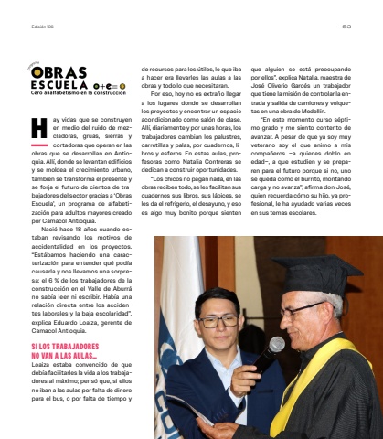 H ay vidas que se construyen en medio del ruido de mezcladoras, gr%u00faas, sierras y cortadoras que operan en las obras que se desarrollan en Antioquia. All%u00ed, donde se levantan edificios y se moldea el crecimiento urbano, tambi%u00e9n se transforma el presente y se forja el futuro de cientos de trabajadores del sector gracias a %u2018Obras Escuela%u2019, un programa de alfabetizaci%u00f3n para adultos mayores creado por Camacol Antioquia. Naci%u00f3 hace 18 a%u00f1os cuando estaban revisando los motivos de accidentalidad en los proyectos. %u201cEst%u00e1bamos haciendo una caracterizaci%u00f3n para entender qu%u00e9 pod%u00eda causarla y nos llevamos una sorpresa: el 6 % de los trabajadores de la construcci%u00f3n en el Valle de Aburr%u00e1 no sab%u00eda leer ni escribir. Hab%u00eda una relaci%u00f3n directa entre los accidentes laborales y la baja escolaridad%u201d, explica Eduardo Loaiza, gerente de Camacol Antioquia. SI LOS TRABAJADORES NO VAN A LAS AULAS%u2026Loaiza estaba convencido de que deb%u00eda facilitarles la vida a los trabajadores al m%u00e1ximo; pens%u00f3 que, si ellos no iban a las aulas por falta de dinero para el bus, o por falta de tiempo y de recursos para los %u00fatiles, lo que iba a hacer era llevarles las aulas a las obras y todo lo que necesitaran.Por eso, hoy no es extra%u00f1o llegar a los lugares donde se desarrollan los proyectos y encontrar un espacio acondicionado como sal%u00f3n de clase. All%u00ed, diariamente y por unas horas, los trabajadores cambian los palustres, carretillas y palas, por cuadernos, libros y esferos. En estas aulas, profesoras como Natalia Contreras se dedican a construir oportunidades.%u201cLos chicos no pagan nada, en las obras reciben todo, se les facilitan sus cuadernos sus libros, sus l%u00e1pices, se les da el refrigerio, el desayuno, y eso es algo muy bonito porque sienten que alguien se est%u00e1 preocupando por ellos%u201d, explica Natalia, maestra de Jos%u00e9 Oliverio Garc%u00e9s un trabajador que tiene la misi%u00f3n de controlar la entrada y salida de camiones y volquetas en una obra de Medell%u00edn.%u201cEn este momento curso s%u00e9ptimo grado y me siento contento de avanzar. A pesar de que ya soy muy veterano soy el que animo a mis compa%u00f1eros %u2013a quienes doblo en edad%u2013, a que estudien y se preparen para el futuro porque si no, uno se queda como el burrito, montando carga y no avanza%u201d, afirma don Jos%u00e9, quien recuerda c%u00f3mo su hijo, ya profesional, le ha ayudado varias veces en sus temas escolares.Edici%u00f3n 106 53