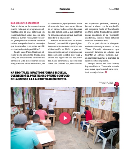 M%u00c1S ALL%u00c1 DE LO ACAD%u00c9MICOEsta iniciativa se ha convertido en mucho m%u00e1s que un programa de alfabetizaci%u00f3n; es una estrategia de responsabilidad social que no solo ense%u00f1a a sumar, restar, leer y escribir. %u00bfHan pensado lo que es tener un celular y no poder leer los mensajes que les mandan, o no poder escribir un chat teniendo la posibilidad?Seg%u00fan Juan Pablo Restrepo, director de la obra donde trabaja don Jos%u00e9, %u201ces emocionante ver c%u00f3mo les cambia la vida. Les ense%u00f1an cosas muy pr%u00e1cticas de su diario vivir, de su cotidianidad, que aprendan a leer el aviso del bus, que sepan firmar en un banco, todo ese tipo de cosas que son del d%u00eda a d%u00eda, y que nosotros no dimensionamos porque pudimos acceder a la educaci%u00f3n%u201d. Ha sido tal el impacto de %u2018Obras Escuela%u2019, que recibi%u00f3 el prestigioso Premio Confucio de la UNESCO a la alfabetizaci%u00f3n en 2019. Un gran reconocimiento para el programa que cada semestre celebra con toga y birrete los logros de sus estudiantes. Esas ceremonias, que muchos viven por primera vez, son s%u00edmbolo de superaci%u00f3n personal, familiar y laboral. Y ahora, con la ampliaci%u00f3n del programa hacia el %u2018Bachillerato en Obra%u2019, estos trabajadores podr%u00e1n seguir escalando en su formaci%u00f3n acad%u00e9mica, incluso hacia estudios t%u00e9cnicos o universitarios.En un pa%u00eds donde la desigualdad educativa sigue siendo un reto, %u2018Obras Escuela%u2019 demuestra que construir tambi%u00e9n es educar, que levantar un edificio tambi%u00e9n puede significar levantar la dignidad de quienes lo hacen posible.Porque detr%u00e1s de cada ladrillo, hay una historia. Y en cada historia, una nueva oportunidad para consHA SIDO TAL EL IMPACTO DE %u2018OBRAS ESCUELA%u2019, truir un mejor futuro. QUE RECIBI%u00d3 EL PRESTIGIOSO PREMIO CONFUCIO DE LA UNESCO A LA ALFABETIZACI%u00d3N EN 2019.H A G A C L I C P A R A VER EL VIDEO54 Regionales Revista
