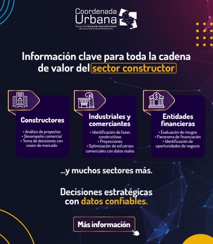 Edici%u00f3n 106 55Informaci%u00f3n clave para toda la cadena de valor del sector constructor...y muchos sectores m%u00e1s. Decisiones estrat%u00e9gicascon datos confiables.Constructores%u2022 An%u00e1lisis de proyectos%u2022 Desempe%u00f1o comercial%u2022 Toma de decisiones con visi%u00f3n de mercadoIndustriales ycomerciantes%u2022 Identificaci%u00f3n de fases constructivas%u2022 Proyecciones%u2022 Optimizaci%u00f3n de esfuerzos comerciales con datos realesEntidadesfinancieras%u2022 Evaluaci%u00f3n de riesgos%u2022 Panorama de financiaci%u00f3n%u2022 Identificaci%u00f3n deoportunidades de negocioM%u00e1s informaci%u00f3n https://camacol.co/productividad-sectorial/modernizacionempresarial/coordenada-urbana