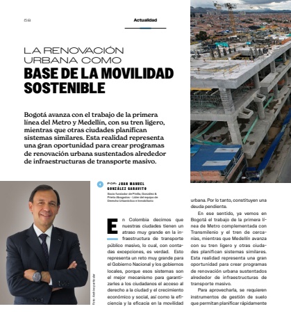 E n Colombia decimos que nuestras ciudades tienen un atraso muy grande en la infraestructura de transporte p%u00fablico masivo, lo cual, con contadas excepciones, es verdad. Esto representa un reto muy grande para el Gobierno Nacional y los gobiernos locales, porque esos sistemas son el mejor mecanismo para garantizarles a los ciudadanos el acceso al derecho a la ciudad y el crecimiento econ%u00f3mico y social, as%u00ed como la eficiencia y la eficacia en la movilidad urbana. Por lo tanto, constituyen una deuda pendiente. En ese sentido, ya vemos en Bogot%u00e1 el trabajo de la primera l%u00ednea de Metro complementada con Transmilenio y el tren de cercan%u00edas, mientras que Medell%u00edn avanza con su tren ligero y otras ciudades planifican sistemas similares. Esta realidad representa una gran oportunidad para crear programas de renovaci%u00f3n urbana sustentados alrededor de infraestructuras de transporte masivo. Para aprovecharla, se requieren instrumentos de gesti%u00f3n de suelo que permitan planificar r%u00e1pidamente LA RENOVACI%u00d3N URBANA COMOBASE DE LA MOVILIDAD SOSTENIBLEBogot%u00e1 avanza con el trabajo de la primera l%u00ednea del Metro y Medell%u00edn, con su tren ligero, mientras que otras ciudades planifican sistemas similares. Esta realidad representa una gran oportunidad para crear programas de renovaci%u00f3n urbana sustentados alrededor de infraestructuras de transporte masivo. POR: J U A N M A N U E L G O N Z %u00c1 L E Z G A R AV I TOSocio fundador de Pinilla, Gonz%u00e1lez & Prieto Abogados - L%u00edder del equipo de Derecho Urban%u00edstico e InmobiliarioFoto: Archivo particular58 Actualidad