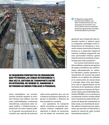 zonas estrat%u00e9gicas, con procedimientos eficaces basados en estudios t%u00e9cnicos que definan usos del suelo, edificabilidades, condiciones volum%u00e9tricas, conexiones entre espacio p%u00fablico e infraestructuras, y producci%u00f3n de nuevo espacio p%u00fablico. En general, una propuesta de renovaci%u00f3n que, adem%u00e1s de potenciar estas zonas, garantice que, una vez el sistema se ponga en operaci%u00f3n, no genere el abandono o deterioro de bienes p%u00fablicos o privados. Los operadores de transporte deben convertirse en grandes operadores urbanos, trabajando paralelamente el dise%u00f1o de estaciones con los planes de renovaci%u00f3n para garantizar que el desarrollo est%u00e9 encauzado cuando el sistema opere. La integraci%u00f3n estrat%u00e9gica entre infraestructura de transporte y renovaci%u00f3n urbana maximizar%u00e1 el impacto positivo en el desarrollo integral de nuestras ciudades, asegurando que esta oportunidad hist%u00f3rica genere transformaciones duraderas y beneficiosas para toda%u00a0la%u00a0poblaci%u00f3n.Con buenos instrumentos se podr%u00e1n establecer sistemas de repartos de cargas y beneficios, que, administrados adecuadamente en veh%u00edculos fiduciarios, podr%u00edan garantizar la recuperaci%u00f3n de recursos del propio sistema con el objetivo de utilizarlos en la construcci%u00f3n de nuevas l%u00edneas y troncales. Buen inicio para Bogot%u00e1 ha sido la reglamentaci%u00f3n de las funciones de los operadores urbanos p%u00fablicos para los Proyectos de Renovaci%u00f3n Urbana para la Movilidad Sostenible (PRUMS), con lo cual ahora le corresponde al sector privado utilizar estos mecanismos proponiendo proyectos de desarrollo interesantes en estas zonas, con iniciativas de acuerdos p%u00fablico-privados para los operadores, que permitan la financiaci%u00f3n y puesta en marcha de, ojal%u00e1, muchas renovaciones urbanas. Foto: Cortes%u00eda Milton D%u00edaz -%u00a0El%u00a0TiempoSE REQUIEREN PROPUESTAS DE RENOVACI%u00d3N QUE POTENCIEN LAS ZONAS INTERVENIDAS Y, UNA VEZ EL SISTEMA DE TRANSPORTE ENTR%u00c9 EN OPERACI%u00d3N, NO GENERE EL ABANDONO O DETERIORO DE BIENES P%u00daBLICOS O PRIVADOS.En Bogot%u00e1 se desarrolla la primera l%u00ednea de Metro, que debe complementarse con una propuesta de renovaci%u00f3n. Una vez el sistema entre en operaci%u00f3n tendr%u00e1 que garantizarse el cuidado de bienes p%u00fablicos y privados.59
