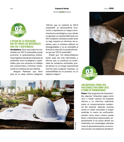 %u00bfUN MATERIAL PUEDE SER SOSTENIBLE POR C%u00d3MO LUCE O C%u00d3MO SE PROMOCIONA?Falso. Para el gerente de Casostenible, algunas %u201cetiquetas vagas como %u2018eco%u2019 o %u2018verde%u2019 carecen de respaldo t%u00e9cnico y no informan realmente sobre el comportamiento ambiental del material. Adem%u00e1s, muchas veces no est%u00e1n asociadas a ning%u00fan est%u00e1ndar ni marco de verificaci%u00f3n. Usarlas como %u00fanico criterio puede llevar a decisiones equivocadas, especialmente si se busca alinear los materiales con estrategias robustas como la descarbonizaci%u00f3n, la econom%u00eda circular o la resiliencia clim%u00e1tica%u201d. 03MITOA PESAR DE LA EVOLUCI%u00d3N, HOY NO TODOS LOS MATERIALES SON 100 % SOSTENIBLESVerdadero. Decir que todos los materiales son 100 % sostenibles puede promover el greenwashing (marketing enga%u00f1oso donde las empresas se presentan como ecol%u00f3gicas y sostenibles, pero sus acciones no reflejan ese compromiso) y terminar erosionando la confianza de sus clientes. Asegura Restrepo que decir esto es un atajo ret%u00f3rico peligroso; %u201cafirmar que un material es 100 % sostenible%u201d es t%u00e9cnicamente incorrecto y representa un riesgo comunicacional y estrat%u00e9gico y voy a darles un ejemplo: un material fabricado con 100 % pl%u00e1stico reciclado puede tener un bajo impacto en t%u00e9rminos de residuos, pero si contiene aditivos no biodegradables o no es reciclable al final de su vida %u00fatil, no puede afirmarse que sea %u201c100 % sostenible%u201d.A%u00f1ade que %u201clos desarrolladores est%u00e1n cada vez m%u00e1s informados, y afirmar que un producto es sostenible sin evidencia verificable, puede derivar en un riesgo reputacional enorme para cualquier empresa. La sostenibilidad es un proceso, no un adjetivo m%u00e1gico%u201d.02MITOFoto: Freepik62 Camacol Verde Revista