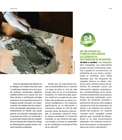 HAY QUE REVISAR LAS ETIQUETAS PARA CONOCER LOS ATRIBUTOS DE SOSTENIBILIDAD DE UN MATERIAL Verdad a medias. Las etiquetas, bien manejadas, son importantes porque brindan informaci%u00f3n esencial y ayudan en la promoci%u00f3n y el marketing de una marca, aumentando la confianza. Dice Felipe Restrepo que %u201clas etiquetas sin respaldo t%u00e9cnico no deben utilizarse como criterios %u00fanicos de selecci%u00f3n. Es necesario contar con informaci%u00f3n objetiva, estandarizada y contextualizada, como declaraciones ambientales de producto, fichas t%u00e9cnicas verificadas, certificados de contenido reciclado o par%u00e1metros t%u00e9rmicos. Esto asegura coherencia entre las decisiones de dise%u00f1o y los objetivos de sostenibilidad del proyecto. Un material rotulado como %u2018amigable%u2019 puede generar gran cantidad de desperdicios si no est%u00e1 correctamente adaptado a los m%u00f3dulos constructivos del proyecto, aumentando residuos de corte o demolici%u00f3n%u201d.Entre los ejemplos que destac%u00f3 en su di%u00e1logo con Urbana mencion%u00f3 que %u201cun adhesivo rotulado como %u2018eco%u2019 puede contener compuestos org%u00e1nicos vol%u00e1tiles (COV) si no cuenta con una ficha t%u00e9cnica o certificaci%u00f3n de bajas emisiones. Si se especifica solo por la etiqueta, puede incumplir con requerimientos de calidad del aire interior%u201d. Puso otro ejemplo relacionado con un revestimiento en bamb%u00fa que puede parecer una elecci%u00f3n sostenible, pero si proviene de cultivo no certificado o es importado desde Asia sin trazabilidad, su impacto de transporte y riesgo de deforestaci%u00f3n pueden anular cualquier beneficio ambiental.A%u00f1ade que %u201ces importante evaluar la sostenibilidad de un material a lo largo de todo su ciclo de vida porque solo as%u00ed se ve el panorama completo. Un material puede parecer %u2018verde%u2019 en su etapa de uso, pero haber sido producido con altos consumos energ%u00e9ticos o con impactos significativos en su fabricaci%u00f3n o transporte. Evaluar el ciclo de vida permite tomar decisiones informadas, al considerar aspectos como el carbono embebido, el contenido reciclado, el uso eficiente del agua o la energ%u00eda, e incluso su capacidad de ser reutilizado o reciclado al final de su vida %u00fatil%u201d. 04MITOFoto: Archivo particularEdici%u00f3n 106 63