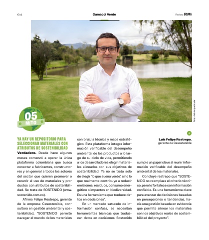 Foto: Archivo particularYA HAY UN REPOSITORIO PARA SELECCIONAR MATERIALES CON ATRIBUTOS DE SOSTENIBILIDADVerdadero. Desde hace algunos meses comenz%u00f3 a operar la %u00fanica plataforma colombiana que busca conectar a fabricantes, constructores y en general a todos los actores del sector que quieren promover o recurrir al uso de materiales y productos con atributos de sostenibilidad. Se trata de SOSTENIDO (www.sostenido.com.co). Afirma Felipe Restrepo, gerente de la empresa Casostenible, consultora en gesti%u00f3n ambiental y sostenibilidad, %u201cSOSTENIDO permite navegar el mundo de los materiales 05MITOcon br%u00fajula t%u00e9cnica y mapa estrat%u00e9gico. Esta plataforma integra informaci%u00f3n verificable del desempe%u00f1o ambiental de los productos a lo largo de su ciclo de vida, permitiendo a los desarrolladores elegir materiales alineados con sus objetivos de sostenibilidad. Ya no se trata solo de elegir %u2018lo que suena verde%u2019, sino lo que realmente contribuye a reducir emisiones, residuos, consumo energ%u00e9tico o impactos en biodiversidad. Es una herramienta que traduce datos en decisiones%u201d.En un mercado saturado de informaci%u00f3n confusa, se necesitan herramientas t%u00e9cnicas que traduzcan datos en decisiones. Sostenido cumple un papel clave al reunir informaci%u00f3n verificable del desempe%u00f1o ambiental de los materiales. Concluye restrepo que %u201cSOSTENIDO no reemplaza el criterio t%u00e9cnico, pero lo fortalece con informaci%u00f3n confiable. Es una herramienta clave para avanzar de decisiones basadas en percepciones o tendencias, hacia una gesti%u00f3n basada en evidencia que permite alinear los materiales con los objetivos reales de sostenibilidad del proyecto%u201d.Luis Felipe Restrepo, gerente de Casostenible64 Camacol Verde Revista