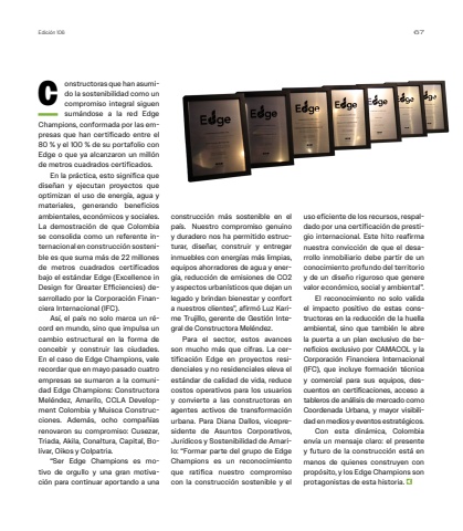 C onstructoras que han asumido la sostenibilidad como un compromiso integral siguen sum%u00e1ndose a la red Edge Champions, conformada por las empresas que han certificado entre el 80 % y el 100 % de su portafolio con Edge o que ya alcanzaron un mill%u00f3n de metros cuadrados certificados. En la pr%u00e1ctica, esto significa que dise%u00f1an y ejecutan proyectos que optimizan el uso de energ%u00eda, agua y materiales, generando beneficios ambientales, econ%u00f3micos y sociales. La demostraci%u00f3n de que Colombia se consolida como un referente internacional en construcci%u00f3n sostenible es que suma m%u00e1s de 22 millones de metros cuadrados certificados bajo el est%u00e1ndar Edge (Excellence in Design for Greater Efficiencies) desarrollado por la Corporaci%u00f3n Financiera Internacional (IFC). As%u00ed, el pa%u00eds no solo marca un r%u00e9cord en mundo, sino que impulsa un cambio estructural en la forma de concebir y construir las ciudades. En el caso de Edge Champions, vale recordar que en mayo pasado cuatro empresas se sumaron a la comunidad Edge Champions: Constructora Mel%u00e9ndez, Amarilo, CCLA Development Colombia y Muisca Construcciones. Adem%u00e1s, ocho compa%u00f1%u00edas renovaron su compromiso: Cusezar, Triada, Akila, Conaltura, Capital, Bol%u00edvar, Oikos y Colpatria.%u201cSer Edge Champions es motivo de orgullo y una gran motivaci%u00f3n para continuar aportando a una construcci%u00f3n m%u00e1s sostenible en el pa%u00eds. Nuestro compromiso genuino y duradero nos ha permitido estructurar, dise%u00f1ar, construir y entregar inmuebles con energ%u00edas m%u00e1s limpias, equipos ahorradores de agua y energ%u00eda, reducci%u00f3n de emisiones de CO2 y aspectos urban%u00edsticos que dejan un legado y brindan bienestar y confort a nuestros clientes%u201d, afirm%u00f3 Luz Karime Trujillo, gerente de Gesti%u00f3n Integral de Constructora Mel%u00e9ndez.Para el sector, estos avances son mucho m%u00e1s que cifras. La certificaci%u00f3n Edge en proyectos residenciales y no residenciales eleva el est%u00e1ndar de calidad de vida, reduce costos operativos para los usuarios y convierte a las constructoras en agentes activos de transformaci%u00f3n urbana. Para Diana Dallos, vicepresidente de Asuntos Corporativos, Jur%u00eddicos y Sostenibilidad de Amarilo: %u201cFormar parte del grupo de Edge Champions es un reconocimiento que ratifica nuestro compromiso con la construcci%u00f3n sostenible y el uso eficiente de los recursos, respaldado por una certificaci%u00f3n de prestigio internacional. Este hito reafirma nuestra convicci%u00f3n de que el desarrollo inmobiliario debe partir de un conocimiento profundo del territorio y de un dise%u00f1o riguroso que genere valor econ%u00f3mico, social y ambiental%u201d.El reconocimiento no solo valida el impacto positivo de estas constructoras en la reducci%u00f3n de la huella ambiental, sino que tambi%u00e9n le abre la puerta a un plan exclusivo de beneficios exclusivo por CAMACOL y la Corporaci%u00f3n Financiera Internacional (IFC), que incluye formaci%u00f3n t%u00e9cnica y comercial para sus equipos, descuentos en certificaciones, acceso a tableros de an%u00e1lisis de mercado como Coordenada Urbana, y mayor visibilidad en medios y eventos estrat%u00e9gicos.Con esta din%u00e1mica, Colombia env%u00eda un mensaje claro: el presente y futuro de la construcci%u00f3n est%u00e1 en manos de quienes construyen con prop%u00f3sito, y los Edge Champions son protagonistas de esta historia. Edici%u00f3n 106 67