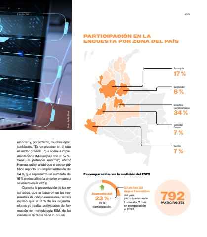 recorrer y, por lo tanto, muchas oportunidades. %u201cEs un proceso en el cual el sector privado %u2013que lidera la implementaci%u00f3n BIM en el pa%u00eds con un 57 %%u2013 tiene un potencial enorme%u201d, afirm%u00f3 Herrera, quien anot%u00f3 que el sector p%u00fablico report%u00f3 una implementaci%u00f3n del 54 %, que represent%u00f3 un aumento del 16 % en dos a%u00f1os (la anterior encuesta se realiz%u00f3 en el 2023). Durante la presentaci%u00f3n de los resultados, que se basaron en las respuestas de 792 encuestados, Herrera explic%u00f3 que el 61 % de las organizaciones ya realiza actividades de formaci%u00f3n en metodolog%u00eda BIM, de las cuales un 67 % las hace in-house.En comparaci%u00f3n con la medici%u00f3n del 2023Bogot%u00e1 y Cundinamarca34 %Santander6 %Nari%u00f1o7 %Valle del Cauca7 %Antioquia17 %PARTICIPACI%u00d3N EN LA ENCUESTA POR ZONA DEL PA%u00cdS792PARTICIPANTESFoto: Adobe StockAumento del 23 %de la participaci%u00f3n.27 de los 32 departamentosdel pa%u00eds participaron en la Encuesta, 2 m%u00e1s en comparaci%u00f3n al 2023.Edici%u00f3n 106 69