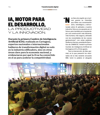 N os llena de orgullo ser el primer gremio en Colombia que lidera una conversaci%u00f3n seria, estrat%u00e9gica y estructurada sobre IA aplicada a nuestra industria. Esta es una apuesta por el futuro, pero tambi%u00e9n por el presente: por una construcci%u00f3n m%u00e1s eficiente, m%u00e1s humana, m%u00e1s segura y alineada con las necesidades de las nuevas generaciones%u201d; con estas palabras Guillermo Herrera, presidente Ejecutivo de CAMACOL instal%u00f3 la primera Cumbre de Inteligencia Artificial en Cartagena el 21 y 22 de agosto. Tras la intervenci%u00f3n de l%u00edder gremial, en la que present%u00f3 los resultados de la m%u00e1s reciente encuesta BIM, tom%u00f3 la palabra el abogado LA PRODUCTIVIDAD Y LA INNOVACI%u00d3N.IA, MOTOR PARA EL DESARROLLO,Durante la primera Cumbre de Inteligencia Artificial (CIA), realizada en Cartagena, expertos nacionales e internacionales hablaron de transformaci%u00f3n digital no solo en la industria edificadora, sino en otras %u00e1reas clave para la econom%u00eda nacional, y evidenciaron por qu%u00e9 la IA se ha convertido en el as para acelerar la competitividad.72 Transformaci%u00f3n digital Revista