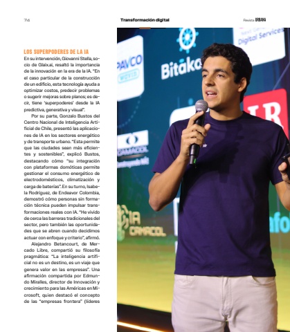 LOS SUPERPODERES DE LA IAEn su intervenci%u00f3n, Giovanni Stella, socio de Glaix.ai, resalt%u00f3 la importancia de la innovaci%u00f3n en la era de la IA. %u201cEn el caso particular de la construcci%u00f3n de un edificio, esta tecnolog%u00eda ayuda a optimizar costos, predecir problemas o sugerir mejoras sobre planos; es decir, tiene %u2018superpoderes%u2019 desde la IA predictiva, generativa y visual%u201d.Por su parte, Gonzalo Bustos del Centro Nacional de Inteligencia Artificial de Chile, present%u00f3 las aplicaciones de IA en los sectores energ%u00e9tico y de transporte urbano. %u201cEsta permite que las ciudades sean m%u00e1s eficientes y sostenibles%u201d, explic%u00f3 Bustos, destacando c%u00f3mo %u201csu integraci%u00f3n con plataformas dom%u00f3ticas permite gestionar el consumo energ%u00e9tico de electrodom%u00e9sticos, climatizaci%u00f3n y carga de bater%u00edas%u201d. En su turno, Isabela Rodr%u00edguez, de Endeavor Colombia, demostr%u00f3 c%u00f3mo personas sin formaci%u00f3n t%u00e9cnica pueden impulsar transformaciones reales con IA. %u201cHe vivido de cerca las barreras tradicionales del sector, pero tambi%u00e9n las oportunidades que se abren cuando decidimos actuar con enfoque y criterio%u201d, afirm%u00f3.Alejandro Betancourt, de Mercado Libre, comparti%u00f3 su filosof%u00eda pragm%u00e1tica: %u201cLa inteligencia artificial no es un destino, es un viaje que genera valor en las empresas%u201d. Una afirmaci%u00f3n compartida por Edmundo Miralles, director de Innovaci%u00f3n y crecimiento para las Am%u00e9ricas en Microsoft, quien destac%u00f3 el concepto de las %u201cempresas frontera%u201d (l%u00edderes 74 Transformaci%u00f3n digital Revista