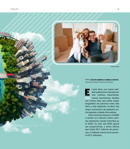 E l pa%u00eds tiene una nueva realidad poblacional marcada por tres cambios importantes: menos nacimientos, familias con menos hijos que antes; mayor longevidad, las personas viven m%u00e1s a%u00f1os, y m%u00e1s migraci%u00f3n, es decir, hay mayor movimiento de poblaci%u00f3n entre regiones y desde otros pa%u00edses.Estos factores llevaron al DANE a revisar sus c%u00e1lculos sobre cu%u00e1ntos habitantes tendr%u00e1 Colombia en el 2050. En julio del 2024 ajust%u00f3 sus proyecciones, y ahora estima que habr%u00e1 55,7 millones de personas; 2 millones menos de lo previsto (57,7 millones).POR: LIZETH GABRIELA BONILLA BOTIADirectora de Estudios Econ%u00f3micos de CamacolFotos: FreepikEdici%u00f3n 106 9