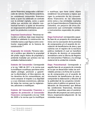 Gu%u00eda de Buenas Pr%u00e1cticas para la venta de vivienda nueva13sector financiero, asegurador o del mercado de valores. Para efectos pr%u00e1cticos, se considerar%u00e1 consumidor financierotanto a quien ha celebrado un contrato con la entidad vigilada, como a quien utiliza sus servicios sin relaci%u00f3n contractual formal o a quien se encuentra en negociaciones preliminares para adquirir los productos o servicios.Empresas Constructoras: Personas naturales o jur%u00eddicas, bajo cuya responsabilidad se adelanta la construcci%u00f3n de vivienda nueva y que figura como constructor responsable en la licencia de construcci%u00f3n.20Enajenador de vivienda: Persona natural o jur%u00eddica que detenta la propiedad del predio seg%u00fan t%u00edtulos de propiedad y pretenda trasladar por primera vez las unidades habitacionales.21Estatuto del Consumidor: Corresponde a la Ley 1480 de 2011 o la norma que la modifique o sustituya, que tiene comoobjeto proteger, promover y garantizar la efectividad y el libre ejercicio de los derechos de los consumidores, as%u00ed como amparar el respeto a su dignidad y a sus intereses econ%u00f3micos, adem%u00e1s de todas las normas que la reglamenten, adicionen o modifiquen.Estatuto del Consumidor Financiero o r%u00e9gimen de protecci%u00f3n al Consumidor Financiero: corresponde a la Ley 1328 de 2009 o la norma que la modifique o sustituya, que tiene como objeto establecer los principios y reglas que rigen la protecci%u00f3n de los consumidores financieros en las relaciones entre estos y las entidades vigiladas por la Superintendencia Financiera de Colombia, sin perjuicio de otras disposiciones que contemplen medidas e instrumentos especiales de protecci%u00f3n.Etapa Contractual: corresponde a aquella fase de un proyecto de vivienda que inicia con la suscripci%u00f3n de la promesa de compraventa y/o el acuerdo de vinculaci%u00f3n de beneficiarios de %u00e1rea y queculmina con el registro de la escritura p%u00fablica mediante el cual se transfiereel derecho de dominio al consumidor inmobiliario ante la Oficina de Registrode Instrumentos P%u00fablicos y la entrega material de la unidad de vivienda. Etapa Precontractual: Corresponde a aquella fase de un proyecto de vivienda en la que se desarrollan todas las actividades previas a la firma de la promesa de compraventa y/o el acuerdo de vinculaci%u00f3n de beneficiarios de %u00e1rea ycomprende la elaboraci%u00f3n y difusi%u00f3n de la publicidad de los proyectos inmobiliarios ante el p%u00fablico en general; la celebraci%u00f3n de documentos que definanlas condiciones financieras, t%u00e9cnicasy jur%u00eddicas requeridas para el posterior desarrollo del proyecto as%u00ed como para la futura enajenaci%u00f3n/adquisici%u00f3n de las viviendas nuevas.20 Ley 1796 de 2016 -Art%u00edculo 2%u00ba21 Ley 1796 de 2016 -Art%u00edculo 2%u00ba