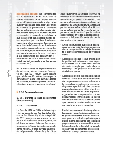 Gu%u00eda de Buenas Pr%u00e1cticas para la venta de vivienda nueva22Informaci%u00f3n Id%u00f3nea: De conformidad con lo establecido en el Diccionario de la Real Academia de la Lengua, el concepto id%u00f3neo corresponde a algo %u201cadecuado y apropiado para algo%u201d, por ende, en materia de protecci%u00f3n al consumidor, se entiende como informaci%u00f3n id%u00f3nea aquella apropiada o adecuada para comprender el proyecto inmobiliario y sus caracter%u00edsticas, especialmente sobre aquellas que resultan fundamentales para el consumidor. Respecto de este tipo de informaci%u00f3n, es fundamental resaltar los aspectos m%u00e1s relevantes del inmueble, especialmente los decisorios para la compra de este, conforme a las expectativas del consumidor (Financiaci%u00f3n, subsidios, acabados, caracter%u00edsticas del inmueble y de las zonas comunes, etc.)En la misma l%u00ednea, la Superintendencia de Industria y Comercio en su Concepto 16- 155160- -00001-0000, resalt%u00f3 que la informaci%u00f3n id%u00f3nea busca que %u201cel consumidor forme una opini%u00f3n acerca de la oferta planteada y tome una decisi%u00f3n de si aceptar o rechazar la misma%u201d. 5.1.2. Recomendaciones 5.1.2.1. Durante la etapa de preventas (Precontractual):5.1.2.1.1. PublicidadLa Circular 004 de 2024 establece que %u201c (%u2026) de acuerdo con los Cap%u00edtulos %u00danicos de los T%u00edtulos V y VI de la Ley 1480 de 2011, para promover la venta de proyectos inmobiliarios en toda pieza publicitaria se deben informar las especificaciones del bien, lo cual comprende, como m%u00ednimo, el %u00e1rea privada construida, el precio de referencia y la ubicaci%u00f3n. Igualmente, se deber%u00e1 informar la direcci%u00f3n exacta en donde se encuentre ubicado el proyecto constructivo, sin perjuicio de que puedan presentarse variaciones de la nomenclatura ordenadas por las autoridades catastrales. EI precio de referencia de la vivienda corresponde al precio m%u00ednimo%u201d, por lo cual se sugiere incluir en todas las piezas publicitarias la informaci%u00f3n se%u00f1alada por la SIC, teniendo en cuenta:%u2022 Antes de difundir la publicidad, asegurarse de que toda la informaci%u00f3n sea cierta, comprobable y refleje fielmente el proyecto inmobiliario de vivienda nueva.%u2022 Asegurarse de que lo que anuncia en la publicidad solamente sea aquello respecto de lo cual tiene certeza de poder cumplir por cada etapa o sub-etapa del proyecto inmobiliario de vivienda nueva.%u2022 Asegurarse que la informaci%u00f3n que se refiera a las caracter%u00edstica o calidadesdel proyecto constructivo, as%u00ed como a la vivienda objeto de venta, que se incluyan en la publicidad, tales como las %u00e1reas privadas construidas o la direcci%u00f3n exacta donde se ubica el proyecto, puedan ser comprobadas por los consumidores inmobiliarios a trav%u00e9s de mecanismos como la existencia de apartamentos modelo o visitas al lugar donde se ubica el proyecto. %u2022%u0009 Identificar claramente toda aquella informaci%u00f3n y caracter%u00edsticas del proyecto que se encuentra incluida en licencias, permisos, estudios y dise%u00f1os para que la misma concuerde con los datos proporcionados al consumidor inmobiliario desde la publicidad, la sala de ventas y los documentos que se suscriban en la etapa precontractual.