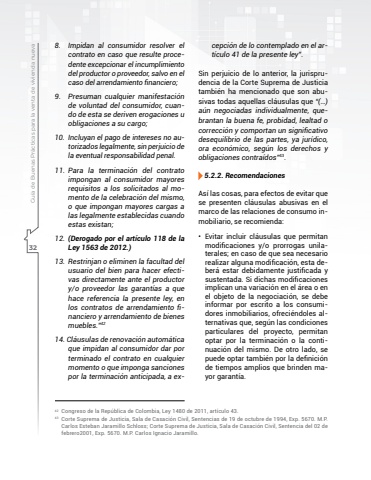 Gu%u00eda de Buenas Pr%u00e1cticas para la venta de vivienda nueva328. Impidan al consumidor resolver el contrato en caso que resulte procedente excepcionar el incumplimiento del productor o proveedor, salvo en el caso del arrendamiento financiero;9. Presuman cualquier manifestaci%u00f3n de voluntad del consumidor, cuando de esta se deriven erogaciones u obligaciones a su cargo;10. Incluyan el pago de intereses no autorizados legalmente, sin perjuicio de la eventual responsabilidad penal.11. Para la terminaci%u00f3n del contrato impongan al consumidor mayores requisitos a los solicitados al momento de la celebraci%u00f3n del mismo, o que impongan mayores cargas a las legalmente establecidas cuando estas existan;12. (Derogado por el art%u00edculo 118 de la Ley 1563 de 2012.)13. Restrinjan o eliminen la facultad del usuario del bien para hacer efectivas directamente ante el productor y/o proveedor las garant%u00edas a que hace referencia la presente ley, en los contratos de arrendamiento financiero y arrendamiento de bienes muebles.%u201d4214. Cl%u00e1usulas de renovaci%u00f3n autom%u00e1tica que impidan al consumidor dar por terminado el contrato en cualquier momento o que imponga sanciones por la terminaci%u00f3n anticipada, a excepci%u00f3n de lo contemplado en el art%u00edculo 41 de la presente ley%u201d.Sin perjuicio de lo anterior, la jurisprudencia de la Corte Suprema de Justicia tambi%u00e9n ha mencionado que son abusivas todas aquellas cl%u00e1usulas que %u201c(%u2026) a%u00fan negociadas individualmente, quebrantan la buena fe, probidad, lealtad o correcci%u00f3n y comportan un significativo desequilibrio de las partes, ya jur%u00eddico, ora econ%u00f3mico, seg%u00fan los derechos y obligaciones contra%u00eddos%u201d43. 5.2.2. Recomendaciones As%u00ed las cosas, para efectos de evitar que se presenten cl%u00e1usulas abusivas en el marco de las relaciones de consumo inmobiliario, se recomienda: %u2022 Evitar incluir cl%u00e1usulas que permitan modificaciones y/o prorrogas unilaterales; en caso de que sea necesario realizar alguna modificaci%u00f3n, esta deber%u00e1 estar debidamente justificada ysustentada. Si dichas modificacionesimplican una variaci%u00f3n en el %u00e1rea o en el objeto de la negociaci%u00f3n, se debe informar por escrito a los consumidores inmobiliarios, ofreci%u00e9ndoles alternativas que, seg%u00fan las condiciones particulares del proyecto, permitan optar por la terminaci%u00f3n o la continuaci%u00f3n del mismo. De otro lado, se puede optar tambi%u00e9n por la definici%u00f3nde tiempos amplios que brinden mayor garant%u00eda.42 Congreso de la Rep%u00fablica de Colombia, Ley 1480 de 2011, art%u00edculo 43.43 Corte Suprema de Justicia, Sala de Casaci%u00f3n Civil, Sentencias de 19 de octubre de 1994, Exp. 5670. M.P. Carlos Esteban Jaramillo Schloss; Corte Suprema de Justicia, Sala de Casaci%u00f3n Civil, Sentencia del 02 de febrero2001, Exp. 5670. M.P. Carlos Ignacio Jaramillo.