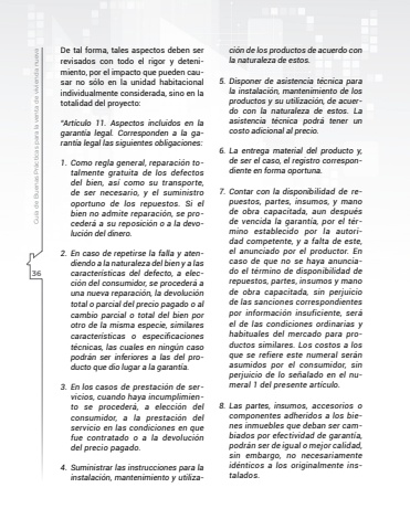 Gu%u00eda de Buenas Pr%u00e1cticas para la venta de vivienda nueva36De tal forma, tales aspectos deben ser revisados con todo el rigor y detenimiento, por el impacto que pueden causar no s%u00f3lo en la unidad habitacional individualmente considerada, sino en la totalidad del proyecto: %u201cArt%u00edculo 11. Aspectos incluidos en la garant%u00eda legal. Corresponden a la garant%u00eda legal las siguientes obligaciones:1. Como regla general, reparaci%u00f3n totalmente gratuita de los defectos del bien, as%u00ed como su transporte, de ser necesario, y el suministro oportuno de los repuestos. Si el bien no admite reparaci%u00f3n, se proceder%u00e1 a su reposici%u00f3n o a la devoluci%u00f3n del dinero.2. En caso de repetirse la falla y atendiendo a la naturaleza del bien y a las caracter%u00edsticas del defecto, a elecci%u00f3n del consumidor, se proceder%u00e1 a una nueva reparaci%u00f3n, la devoluci%u00f3n total o parcial del precio pagado o al cambio parcial o total del bien por otro de la misma especie, similares caracter%u00edsticas o especificaciones t%u00e9cnicas, las cuales en ning%u00fan caso podr%u00e1n ser inferiores a las del producto que dio lugar a la garant%u00eda.3. En los casos de prestaci%u00f3n de servicios, cuando haya incumplimiento se proceder%u00e1, a elecci%u00f3n del consumidor, a la prestaci%u00f3n del servicio en las condiciones en que fue contratado o a la devoluci%u00f3n del precio pagado.4. Suministrar las instrucciones para la instalaci%u00f3n, mantenimiento y utilizaci%u00f3n de los productos de acuerdo con la naturaleza de estos.5. Disponer de asistencia t%u00e9cnica para la instalaci%u00f3n, mantenimiento de los productos y su utilizaci%u00f3n, de acuerdo con la naturaleza de estos. La asistencia t%u00e9cnica podr%u00e1 tener un costo adicional al precio.6. La entrega material del producto y, de ser el caso, el registro correspondiente en forma oportuna.7. Contar con la disponibilidad de repuestos, partes, insumos, y mano de obra capacitada, aun despu%u00e9s de vencida la garant%u00eda, por el t%u00e9rmino establecido por la autoridad competente, y a falta de este, el anunciado por el productor. En caso de que no se haya anunciado el t%u00e9rmino de disponibilidad de repuestos, partes, insumos y mano de obra capacitada, sin perjuicio de las sanciones correspondientes por informaci%u00f3n insuficiente, ser%u00e1 el de las condiciones ordinarias y habituales del mercado para productos similares. Los costos a los que se refiere este numeral ser%u00e1n asumidos por el consumidor, sin perjuicio de lo se%u00f1alado en el numeral 1 del presente art%u00edculo.8. Las partes, insumos, accesorios o componentes adheridos a los bienes inmuebles que deban ser cambiados por efectividad de garant%u00eda, podr%u00e1n ser de igual o mejor calidad, sin embargo, no necesariamente id%u00e9nticos a los originalmente instalados.