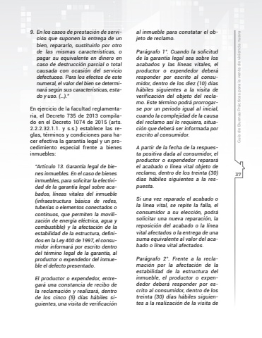 Gu%u00eda de Buenas Pr%u00e1cticas para la venta de vivienda nueva379. En los casos de prestaci%u00f3n de servicios que suponen la entrega de un bien, repararlo, sustituirlo por otro de las mismas caracter%u00edsticas, o pagar su equivalente en dinero en caso de destrucci%u00f3n parcial o total causada con ocasi%u00f3n del servicio defectuoso. Para los efectos de este numeral, el valor del bien se determinar%u00e1 seg%u00fan sus caracter%u00edsticas, estado y uso. (%u2026).%u201d En ejercicio de la facultad reglamentaria, el Decreto 735 de 2013 compilado en el Decreto 1074 de 2015 (arts. 2.2.2.32.1.1. y s.s.) establece las reglas, t%u00e9rminos y condiciones para hacer efectiva la garant%u00eda legal y un procedimiento especial frente a bienes inmuebles: %u201cArt%u00edculo 13. Garant%u00eda legal de bienes inmuebles. En el caso de bienes inmuebles, para solicitar la efectividad de la garant%u00eda legal sobre acabados, l%u00edneas vitales del inmueble (infraestructura b%u00e1sica de redes, tuber%u00edas o elementos conectados o continuos, que permiten la movilizaci%u00f3n de energ%u00eda el%u00e9ctrica, agua y combustible) y la afectaci%u00f3n de la estabilidad de la estructura, definidos en la Ley 400 de 1997, el consumidor informar%u00e1 por escrito dentro del t%u00e9rmino legal de la garant%u00eda, al productor o expendedor del inmueble el defecto presentado.El productor o expendedor, entregar%u00e1 una constancia de recibo de la reclamaci%u00f3n y realizar%u00e1, dentro de los cinco (5) d%u00edas h%u00e1biles siguientes, una visita de verificaci%u00f3n al inmueble para constatar el objeto de reclamo.Par%u00e1grafo 1%u00b0. Cuando la solicitud de la garant%u00eda legal sea sobre los acabados y las l%u00edneas vitales, el productor o expendedor deber%u00e1 responder por escrito al consumidor, dentro de los diez (10) d%u00edas h%u00e1biles siguientes a la visita de verificaci%u00f3n del objeto del reclamo. Este t%u00e9rmino podr%u00e1 prorrogarse por un periodo igual al inicial, cuando la complejidad de la causa del reclamo as%u00ed lo requiera, situaci%u00f3n que deber%u00e1 ser informada por escrito al consumidor.A partir de la fecha de la respuesta positiva dada al consumidor, el productor o expendedor reparar%u00e1 el acabado o l%u00ednea vital objeto de reclamo, dentro de los treinta (30) d%u00edas h%u00e1biles siguientes a la respuesta.Si una vez reparado el acabado o la l%u00ednea vital, se repite la falla, el consumidor a su elecci%u00f3n, podr%u00e1 solicitar una nueva reparaci%u00f3n, la reposici%u00f3n del acabado o la l%u00ednea vital afectados o la entrega de una suma equivalente al valor del acabado o l%u00ednea vital afectados.Par%u00e1grafo 2%u00b0. Frente a la reclamaci%u00f3n por la afectaci%u00f3n de la estabilidad de la estructura del inmueble, el productor o expendedor deber%u00e1 responder por escrito al consumidor, dentro de los treinta (30) d%u00edas h%u00e1biles siguientes a la realizaci%u00f3n de la visita de