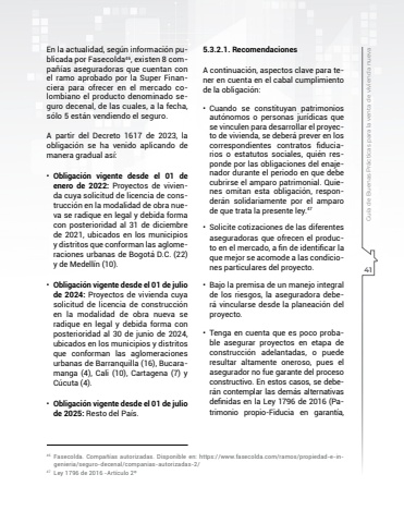 Gu%u00eda de Buenas Pr%u00e1cticas para la venta de vivienda nueva41En la actualidad, seg%u00fan informaci%u00f3n publicada por Fasecolda46, existen 8 compa%u00f1%u00edas aseguradoras que cuentan con el ramo aprobado por la Super Financiera para ofrecer en el mercado colombiano el producto denominado seguro decenal, de las cuales, a la fecha, s%u00f3lo 5 est%u00e1n vendiendo el seguro.A partir del Decreto 1617 de 2023, la obligaci%u00f3n se ha venido aplicando de manera gradual as%u00ed: %u2022 Obligaci%u00f3n vigente desde el 01 de enero de 2022: Proyectos de vivienda cuya solicitud de licencia de construcci%u00f3n en la modalidad de obra nueva se radique en legal y debida forma con posterioridad al 31 de diciembre de 2021, ubicados en los municipios y distritos que conforman las aglomeraciones urbanas de Bogot%u00e1 D.C. (22) y de Medell%u00edn (10).%u2022 Obligaci%u00f3n vigente desde el 01 de julio de 2024: Proyectos de vivienda cuya solicitud de licencia de construcci%u00f3n en la modalidad de obra nueva se radique en legal y debida forma con posterioridad al 30 de junio de 2024, ubicados en los municipios y distritos que conforman las aglomeraciones urbanas de Barranquilla (16), Bucaramanga (4), Cali (10), Cartagena (7) y C%u00facuta (4).%u2022 Obligaci%u00f3n vigente desde el 01 de julio de 2025: Resto del Pa%u00eds.5.3.2.1. RecomendacionesA continuaci%u00f3n, aspectos clave para tener en cuenta en el cabal cumplimiento de la obligaci%u00f3n:%u2022 Cuando se constituyan patrimonios aut%u00f3nomos o personas jur%u00eddicas que se vinculen para desarrollar el proyecto de vivienda, se deber%u00e1 prever en los correspondientes contratos fiduciarios o estatutos sociales, qui%u00e9n responde por las obligaciones del enajenador durante el periodo en que debe cubrirse el amparo patrimonial. Quienes omitan esta obligaci%u00f3n, responder%u00e1n solidariamente por el amparo de que trata la presente ley.47%u2022 Solicite cotizaciones de las diferentes aseguradoras que ofrecen el producto en el mercado, a fin de identificar laque mejor se acomode a las condiciones particulares del proyecto.%u2022 Bajo la premisa de un manejo integral de los riesgos, la aseguradora deber%u00e1 vincularse desde la planeaci%u00f3n del proyecto.%u2022 Tenga en cuenta que es poco probable asegurar proyectos en etapa de construcci%u00f3n adelantadas, o puede resultar altamente oneroso, pues el asegurador no fue garante del proceso constructivo. En estos casos, se deber%u00e1n contemplar las dem%u00e1s alternativas definidas en la Ley 1796 de 2016 (Patrimonio propio-Fiducia en garant%u00eda, 46 Fasecolda. Compa%u00f1%u00edas autorizadas. Disponible en: https://www.fasecolda.com/ramos/propiedad-e-ingenieria/seguro-decenal/companias-autorizadas-2/47 Ley 1796 de 2016 -Art%u00edculo 2%u00ba