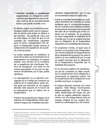 Gu%u00eda de Buenas Pr%u00e1cticas para la venta de vivienda nueva4350 C%u00f3digo de Comercio -Art%u00edculo 107. El asegurador, una vez indemnizado el da%u00f1o, tendr%u00e1 derecho a subrogarse en las acciones que pueda ejercer el asegurado contra el responsable del da%u00f1o, en la medida en que le haya indemnizado. 51 Num. 4 Art. 2%u00b0 Ley 1796 de 2016: %u201cUnidad estructuralmente independiente: Conjunto de elementos estructurales que ensamblados est%u00e1n en capacidad de soportar las cargas gravitacionales y fuerzas horizonta,les que se generan en una edificaci%u00f3n individual o arquitect%u00f3nicamente independiente, trasmiti%u00e9ndolas al suelo de fundaci%u00f3n.%u201d%uf0fc Contrato sometido a condiciones suspensivas: Es obligaci%u00f3n condicional la que depende de una condici%u00f3n, esto es, de un acontecimiento futuro, que puede suceder o no.%u2022 En efecto, seg%u00fan sus condiciones particulares defina junto con el Asegurador, la opci%u00f3n que mejor se adecue a las mismas. No pierda de vista, que en esta etapa, en caso de que no se cumplan las condiciones pactadas para el futuro otorgamiento del seguro, el Asegurador puede revocar el compromiso de expedici%u00f3n de la p%u00f3liza, si as%u00ed se pact%u00f3.%u2022 La suma asegurada se establece al inicio de la obra con fundamento en el presupuesto, sin embargo, se sugiere realizar una revisi%u00f3n en el momento de la expedici%u00f3n del Certificado T%u00e9cnico de Ocupaci%u00f3n, con base en los costos ejecutados vs los que se planearon inicialmente, por lo que, podr%u00e1 ajustarse. %u2022 La subrogaci%u00f3n50 es un derecho consagrado en el C%u00f3digo de Comercio en cabeza de la aseguradora, quien podr%u00e1 optar por ejercerlo no. Se sugiere abordar este aspecto en el marco de la negociaci%u00f3n que se realice con la Aseguradora.%u2022 Frente a los proyectos por etapas, en la pr%u00e1ctica, las Aseguradoras vienen aplicando el seguro por Unidades estructuralmente independientes51, por lo cual se recomienda revisar en cada caso.%u2022%u0009 Frente a viviendas financiadas con subsidios familiares de vivienda, la norma establece que el constructor/enajenador de vivienda nueva deber%u00e1 constituir el mecanismo de amparo por la porci%u00f3n del valor de la vivienda que no fue cubierta con el subsidio. En la pr%u00e1ctica, se viene asegurando la totalidad de la vivienda, por lo cual se sugiere precisar que es obligaci%u00f3n de la Aseguradora responder por la totalidad del proyecto.%u2022 En proyectos mixtos, al igual que el anterior, en la pr%u00e1ctica las Aseguradoras vienen exigiendo el aseguramiento de la totalidad del proyecto (no s%u00f3lo lo relativo al uso residencial) por lo cual se sugiere precisar que es obligaci%u00f3n de la Aseguradora responder por la totalidad del proyecto.%u2022 En la escritura p%u00fablica de transferencia de las viviendas se debe acreditar el cumplimiento de la obligaci%u00f3n y protocolizar la respectiva p%u00f3liza. Sin el cumplimiento de la obligaci%u00f3n no es posible escriturar ni registrar.%u2022 El seguro decenal coexiste con otros seguros: Todo Riesgo Construcci%u00f3n, Responsabilidad Civil de Profesionales, Multiriesgo del Hogar, etc, por lo que se sugiere adelantar negociaciones con las Aseguradoras para un manejo integral de los riesgos (Evitando los sobreseguros) y los costos.