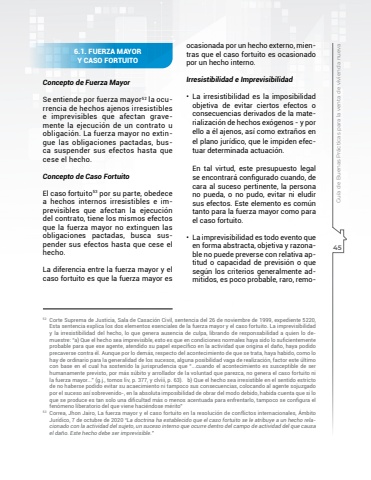 Gu%u00eda de Buenas Pr%u00e1cticas para la venta de vivienda nueva456.1. FUERZA MAYOR Y CASO FORTUITOConcepto de Fuerza MayorSe entiende por fuerza mayor52 la ocurrencia de hechos ajenos irresistibles e imprevisibles que afectan gravemente la ejecuci%u00f3n de un contrato u obligaci%u00f3n. La fuerza mayor no extingue las obligaciones pactadas, busca suspender sus efectos hasta que cese el hecho.Concepto de Caso FortuitoEl caso fortuito53 por su parte, obedece a hechos internos irresistibles e imprevisibles que afectan la ejecuci%u00f3n del contrato, tiene los mismos efectos que la fuerza mayor no extinguen las obligaciones pactadas, busca suspender sus efectos hasta que cese el hecho.La diferencia entre la fuerza mayor y el caso fortuito es que la fuerza mayor es ocasionada por un hecho externo, mientras que el caso fortuito es ocasionado por un hecho interno.Irresistibilidad e Imprevisibilidad%u2022 La irresistibilidad es la imposibilidad objetiva de evitar ciertos efectos o consecuencias derivados de la materializaci%u00f3n de hechos ex%u00f3genos - y por ello a %u00e9l ajenos, as%u00ed como extra%u00f1os en el plano jur%u00eddico, que le impiden efectuar determinada actuaci%u00f3n. En tal virtud, este presupuesto legal se encontrar%u00e1 configurado cuando, decara al suceso pertinente, la persona no pueda, o no pudo, evitar ni eludir sus efectos. Este elemento es com%u00fan tanto para la fuerza mayor como para el caso fortuito.%u2022 La imprevisibilidad es todo evento que en forma abstracta, objetiva y razonable no puede preverse con relativa aptitud o capacidad de previsi%u00f3n o que seg%u00fan los criterios generalmente admitidos, es poco probable, raro, remo52 Corte Suprema de Justicia, Sala de Casaci%u00f3n Civil, sentencia del 26 de noviembre de 1999, expediente 5220, Esta sentencia explica los dos elementos esenciales de la fuerza mayor y el caso fortuito. La imprevisibilidad y la irresistibilidad del hecho, lo que genera ausencia de culpa, librando de responsabilidad a quien lo demuestre: %u201ca) Que el hecho sea imprevisible, esto es que en condiciones normales haya sido lo suficientementeprobable para que ese agente, atendido su papel espec%u00edfico en la actividad que origina el da%u00f1o, haya podidoprecaverse contra %u00e9l. Aunque por lo dem%u00e1s, respecto del acontecimiento de que se trata, haya habido, como lo hay de ordinario para la generalidad de los sucesos, alguna posibilidad vaga de realizaci%u00f3n, factor este %u00faltimo con base en el cual ha sostenido la jurisprudencia que %u201c...cuando el acontecimiento es susceptible de ser humanamente previsto, por m%u00e1s s%u00fabito y arrollador de la voluntad que parezca, no genera el caso fortuito ni la fuerza mayor...%u201d (g.j., tomos liv, p. 377, y clviii, p. 63). b) Que el hecho sea irresistible en el sentido estricto de no haberse podido evitar su acaecimiento ni tampoco sus consecuencias, colocando al agente sojuzgado por el suceso as%u00ed sobrevenido-, en la absoluta imposibilidad de obrar del modo debido, habida cuenta que si lo que se produce es tan solo una dificultad m%u00e1s o menos acentuada para enfrentarlo, tampoco se configura elfen%u00f3meno liberatorio del que viene haci%u00e9ndose m%u00e9rito%u201d 53 Correa, Jhon Jairo, La fuerza mayor y el caso fortuito en la resoluci%u00f3n de conflictos internacionales, %u00c1mbito Jur%u00eddico, 7 de octubre de 2020 %u201cLa doctrina ha establecido que el caso fortuito se le atribuye a un hecho relacionado con la actividad del sujeto, un suceso interno que ocurre dentro del campo de actividad del que causa el da%u00f1o. Este hecho debe ser imprevisible.%u201d