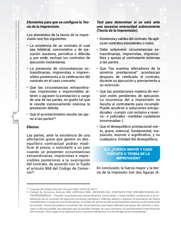 Gu%u00eda de Buenas Pr%u00e1cticas para la venta de vivienda nueva48Elementos para que se configure la Teor%u00eda de la Imprevisi%u00f3n.Los elementos de la teor%u00eda de la imprevisi%u00f3n son los siguientes:%u2022 La existencia de un contrato el cual sea bilateral, conmutativo y de ejecuci%u00f3n sucesiva, peri%u00f3dica o diferida y, por ende, excluye los contratos de ejecuci%u00f3n instant%u00e1nea; %u2022 La presencia de circunstancias extraordinarias, imprevistas o imprevisibles posteriores a la celebraci%u00f3n del contrato en el caso concreto; %u2022 Que las circunstancias extraordinarias, imprevistas e imprevisibles alteren o agraven la prestaci%u00f3n a cargo de una de las partes, en grado tal que le resulte excesivamente onerosa la prestaci%u00f3n debida.%u2022 Que el acontecimiento resulte ser ajeno a las partes59. Efectos.Las partes, ante la existencia de una afectaci%u00f3n grave que genere un desequilibrio contractual podr%u00e1n modificar el precio, o solicitarlo a un juez cuando se presenten circunstancias extraordinarias, imprevistas e imprevisibles posteriores a la suscripci%u00f3n del contrato, de acuerdo con lo fijado el art%u00edculo 868 del C%u00f3digo de Comercio60.59 Consejo de Estado Secci%u00f3n Tercera Fallo 15476 de 2011. 60 C%u00f3digo de Comercio Art%u00edculo 868: ART%u00cdCULO 868. . %u201cCuando circunstancias extraordinarias, imprevistas o imprevisibles, posteriores a la celebraci%u00f3n de un contrato de ejecuci%u00f3n sucesiva, peri%u00f3dica o diferida, alteren o agraven la prestaci%u00f3n de futuro cumplimiento a cargo de una de las partes, en grado tal que le resulte excesivamente onerosa, podr%u00e1 %u00e9sta pedir su revisi%u00f3n. El juez proceder%u00e1 a examinar las circunstancias que hayan alterado las bases del contrato y ordenar%u00e1, si ello es posible, los reajustes que la equidad indique; en caso contrario, el juez decretar%u00e1 la terminaci%u00f3n del contrato. Esta regla no se aplicar%u00e1 a los contratos aleatorios ni a los de ejecuci%u00f3n instant%u00e1nea.%u201dTest para determinar si se est%u00e1 ante una excesiva onerosidad sobreviniente (Teor%u00eda de la Imprevisi%u00f3n).%u2022 Existencia y validez del contrato. No aplica en contratos inexistentes o nulos.%u2022 Debe sobrevenir circunstancias extraordinarias, imprevistas, imprevisibles y ajenas al contratante externas a las partes.%u2022 Que %u201clos eventos alteradores de la simetr%u00eda prestacional%u201d acontezcan despu%u00e9s de celebrado el contrato, durante su ejecuci%u00f3n y previamente a su extinci%u00f3n. %u2022 Que las prestaciones materia de revisi%u00f3n est%u00e9n pendientes de ejecuci%u00f3n. La ocurrencia del a imprevisi%u00f3n no faculta al contratante para incumplir. Puede acudirse a soluciones extrajudiciales -cumplir con reclamo y reserva- o judiciales -medidas cautelares innominadas-). %u2022 Que el desequilibrio prestacional cierto, grave, esencial, fundamental, may%u00fasculo, enorme o significativo, y nocualquiera. Entidad del desequilibrio, 6.3. %u00bfFUERZA MAYOR Y CASO FORTUITO O TEOR%u00cdA DE LA IMPREVISI%u00d3N?En conclusi%u00f3n, la fuerza mayor y la teor%u00eda de la impresi%u00f3n son dos figuras di-