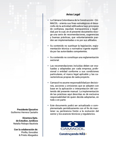 Aviso Legal%uf09f La C%u00e1mara Colombiana de la Construcci%u00f3n -CAMACOL- orienta sus fines estrat%u00e9gicos el desarrollo de la actividad edificadora bajo principiosde confianza, equidad, transparencia y legalidad, por lo cual, en el presente documento recoge una serie de recomendaciones, sugerencias y buenas pr%u00e1cticas, que voluntariamente pueden ser implementadas o no por sus afiliados. %uf09f Su contenido no sustituye la legislaci%u00f3n, reglamentaci%u00f3n t%u00e9cnica o normativa vigente expedida por las autoridades competentes.%uf09f Su contenido no constituye una reglamentaci%u00f3n sectorial.%uf09f Las recomendaciones incluidas deben ser evaluadas y adaptadas por cada empresa, profesional o entidad conforme a sus condiciones particulares, el marco legal aplicable y las caracter%u00edsticas propias de cada proyecto.%uf09f Camacol no asume responsabilidad por decisiones, acciones u omisiones que se adopten con base en la aplicaci%u00f3n o interpretaci%u00f3n del contenido del presente manual. La implementaci%u00f3n de las pr%u00e1cticas aqu%u00ed descritas es de exclusiva responsabilidad de quien decida adoptarlas, en todo o en parte.%uf09f Este documento podr%u00e1 ser actualizado o complementado peri%u00f3dicamente con el fin de mantener su pertinencia frente a la evoluci%u00f3n del sector y los avances t%u00e9cnicos y regulatorios.Presidente EjecutivoGuillermo Herrera Casta%u00f1oDirectora Dpto. de Estudios Jur%u00eddicosNatalia Robayo BautistaCon la colaboraci%u00f3n de:Pinilla, Gonz%u00e1lez & Prieto Abogados