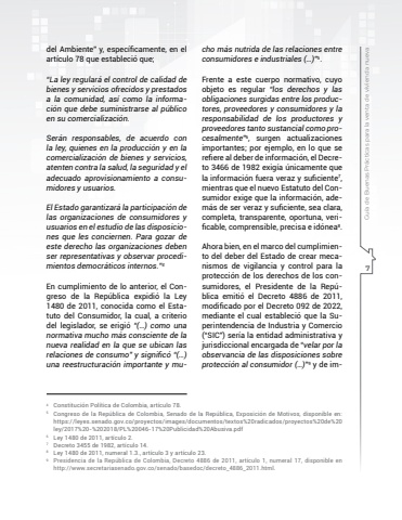 Gu%u00eda de Buenas Pr%u00e1cticas para la venta de vivienda nueva7del Ambiente%u201d y, espec%u00edficamente, en elart%u00edculo 78 que estableci%u00f3 que;%u201cLa ley regular%u00e1 el control de calidad de bienes y servicios ofrecidos y prestados a la comunidad, as%u00ed como la informaci%u00f3n que debe suministrarse al p%u00fablico en su comercializaci%u00f3n.Ser%u00e1n responsables, de acuerdo con la ley, quienes en la producci%u00f3n y en la comercializaci%u00f3n de bienes y servicios, atenten contra la salud, la seguridad y el adecuado aprovisionamiento a consumidores y usuarios.El Estado garantizar%u00e1 la participaci%u00f3n de las organizaciones de consumidores y usuarios en el estudio de las disposiciones que les conciernen. Para gozar de este derecho las organizaciones deben ser representativas y observar procedimientos democr%u00e1ticos internos.%u201d4En cumplimiento de lo anterior, el Congreso de la Rep%u00fablica expidi%u00f3 la Ley 1480 de 2011, conocida como el Estatuto del Consumidor, la cual, a criterio del legislador, se erigi%u00f3 %u201c(%u2026) como una normativa mucho m%u00e1s consciente de la nueva realidad en la que se ubican las relaciones de consumo%u201d y signific%u00f3 %u201c(%u2026) una reestructuraci%u00f3n importante y mucho m%u00e1s nutrida de las relaciones entre consumidores e industriales (%u2026)%u201d5.Frente a este cuerpo normativo, cuyo objeto es regular %u201clos derechos y las obligaciones surgidas entre los productores, proveedores y consumidores y la responsabilidad de los productores y proveedores tanto sustancial como procesalmente%u201d6, surgen actualizaciones importantes; por ejemplo, en lo que se refiere al deber de informaci%u00f3n, el Decreto 3466 de 1982 exig%u00eda %u00fanicamente que la informaci%u00f3n fuera veraz y suficiente7, mientras que el nuevo Estatuto del Consumidor exige que la informaci%u00f3n, adem%u00e1s de ser veraz y suficiente, sea clara,completa, transparente, oportuna, verificable, comprensible, precisa e id%u00f3nea8. Ahora bien, en el marco del cumplimiento del deber del Estado de crear mecanismos de vigilancia y control para la protecci%u00f3n de los derechos de los consumidores, el Presidente de la Rep%u00fablica emiti%u00f3 el Decreto 4886 de 2011, modificado por el Decreto 092 de 2022,mediante el cual estableci%u00f3 que la Superintendencia de Industria y Comercio (%u201cSIC%u201d) ser%u00eda la entidad administrativa y jurisdiccional encargada de %u201cvelar por la observancia de las disposiciones sobre protecci%u00f3n al consumidor (%u2026)%u201d9 y de im4 Constituci%u00f3n Pol%u00edtica de Colombia, art%u00edculo 78.5 Congreso de la Rep%u00fablica de Colombia, Senado de la Rep%u00fablica, Exposici%u00f3n de Motivos, disponible en: https://leyes.senado.gov.co/proyectos/images/documentos/textos%20radicados/proyectos%20de%20ley/2017%20-%202018/PL%20046-17%20Publicidad%20Abusiva.pdf 6 Ley 1480 de 2011, art%u00edculo 2. 7 Decreto 3455 de 1982, art%u00edculo 14.8 Ley 1480 de 2011, numeral 1.3., art%u00edculo 3 y art%u00edculo 23.9 Presidencia de la Rep%u00fablica de Colombia, Decreto 4886 de 2011, art%u00edculo 1, numeral 17, disponible en http://www.secretariasenado.gov.co/senado/basedoc/decreto_4886_2011.html.